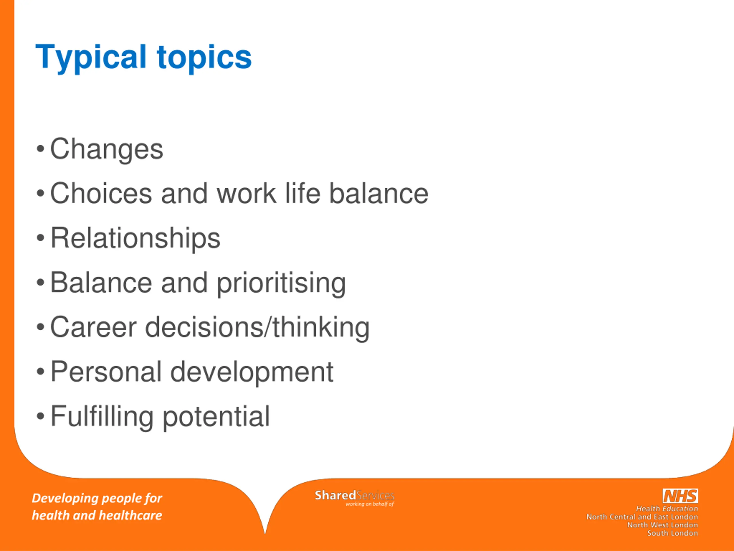 Typical topics Changes Choices and work life balance Relationships Balance and prioritising Career decisions/thinking Personal development Fulfilling potential Developing people for health and healthcare working on behalf of