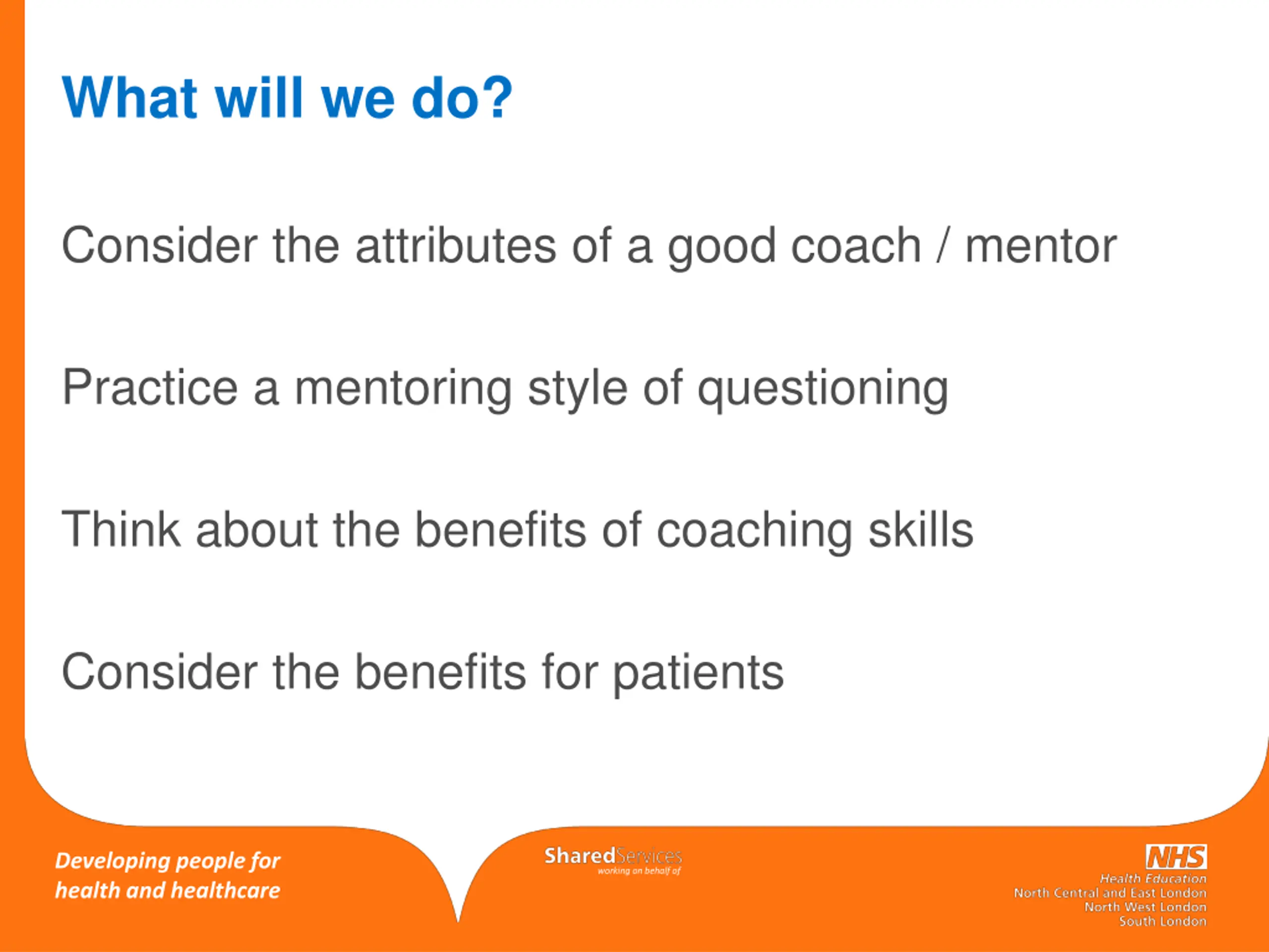 What will we do? Consider the attributes of a good coach / mentor Practice a mentoring style of questioning Think about the benefits of coaching skills Consider the benefits for patients Developing people for health and healthcare working on behalf of