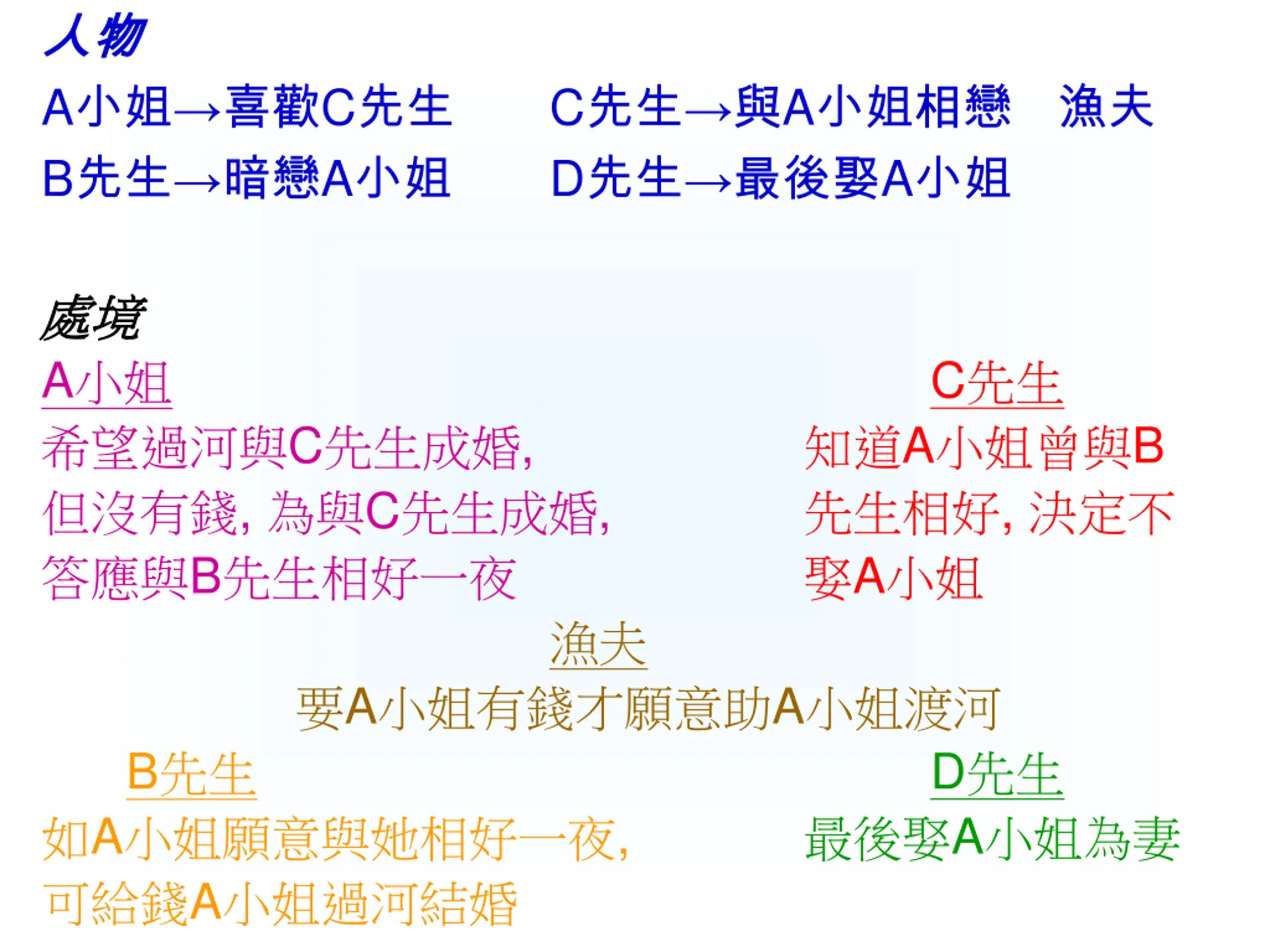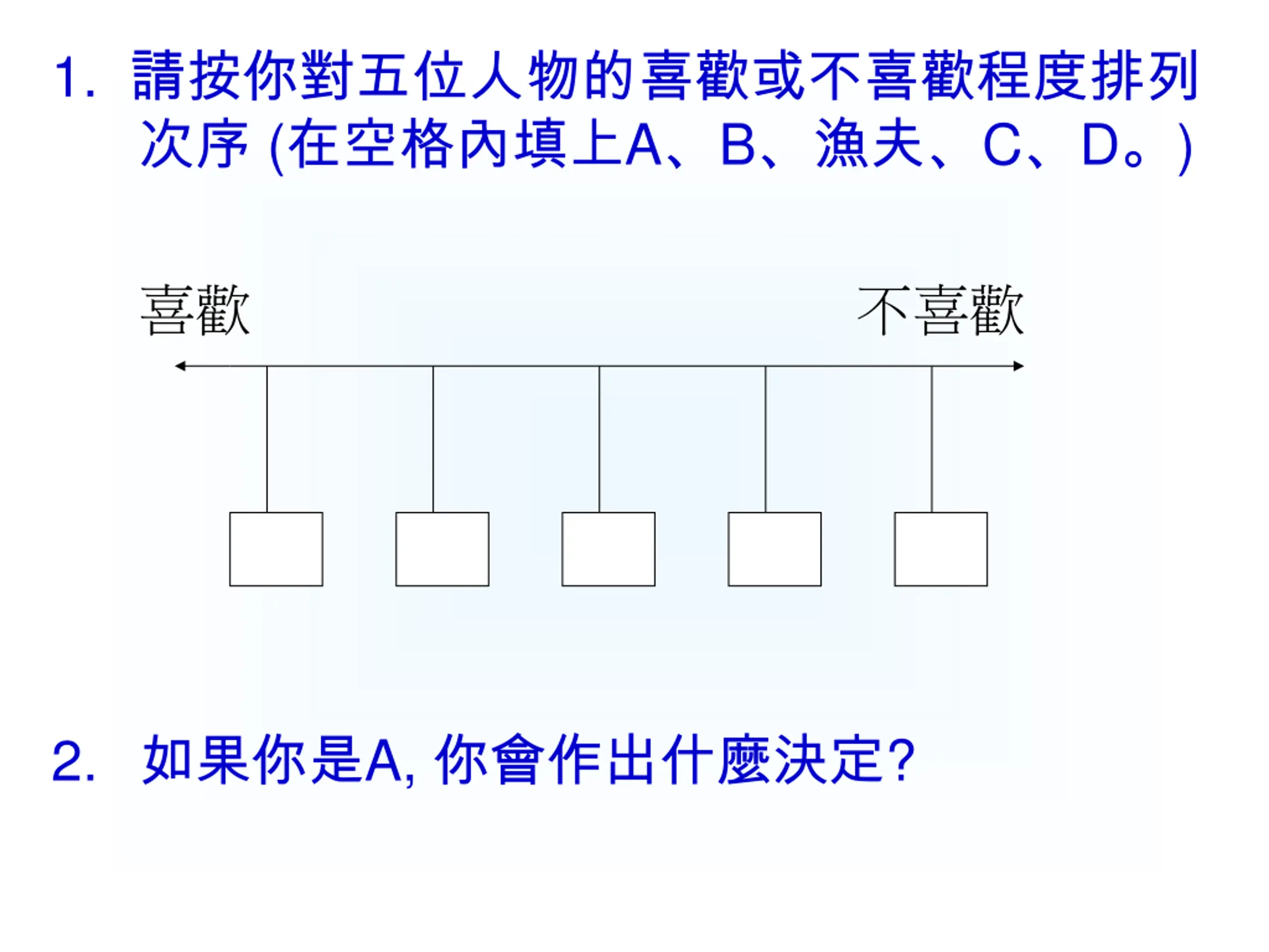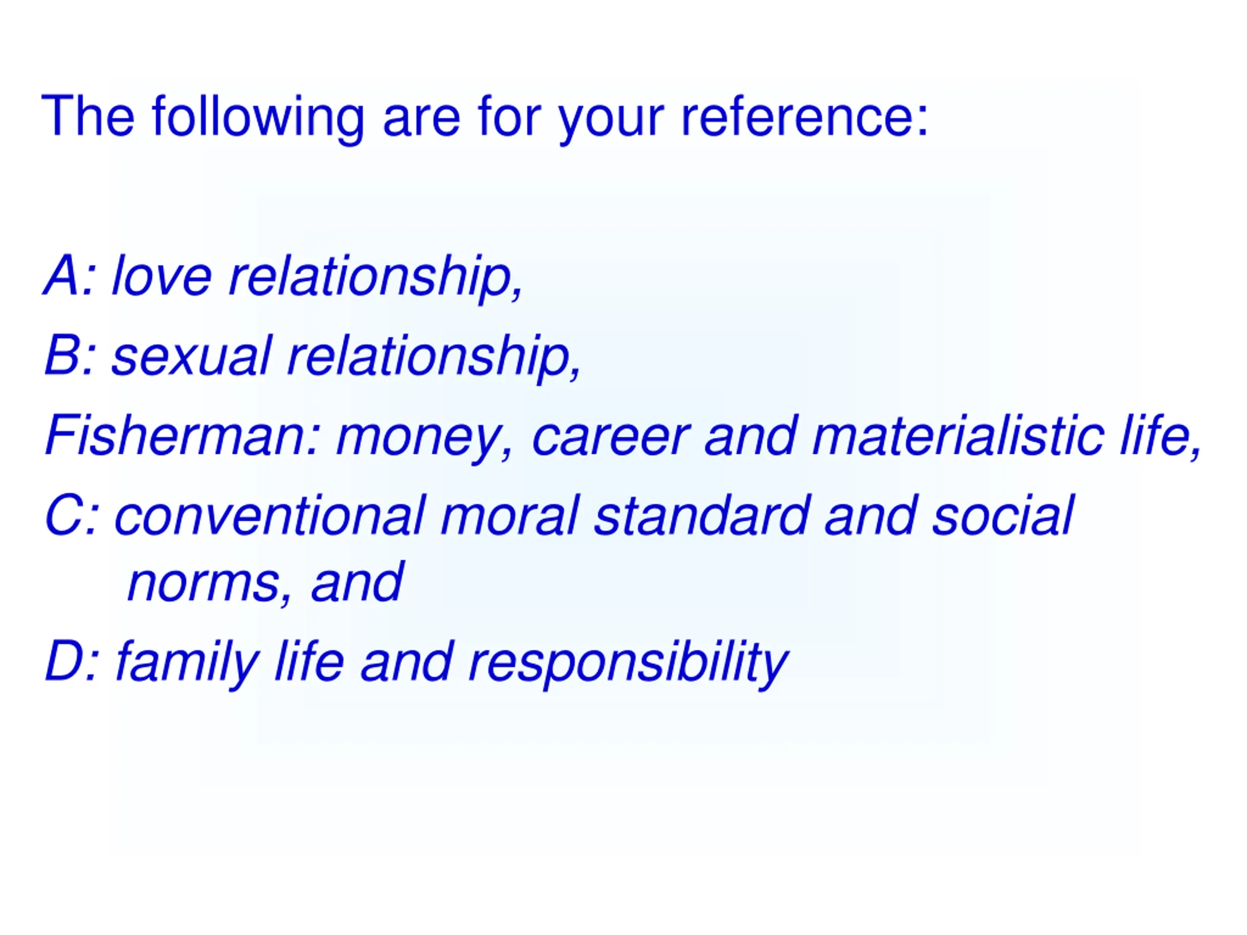 The following are for your reference: A: love relationship, B: sexual relationship, Fisherman: money, career and materialistic life, C: conventional moral standard and social norms, and D: family life and responsibility