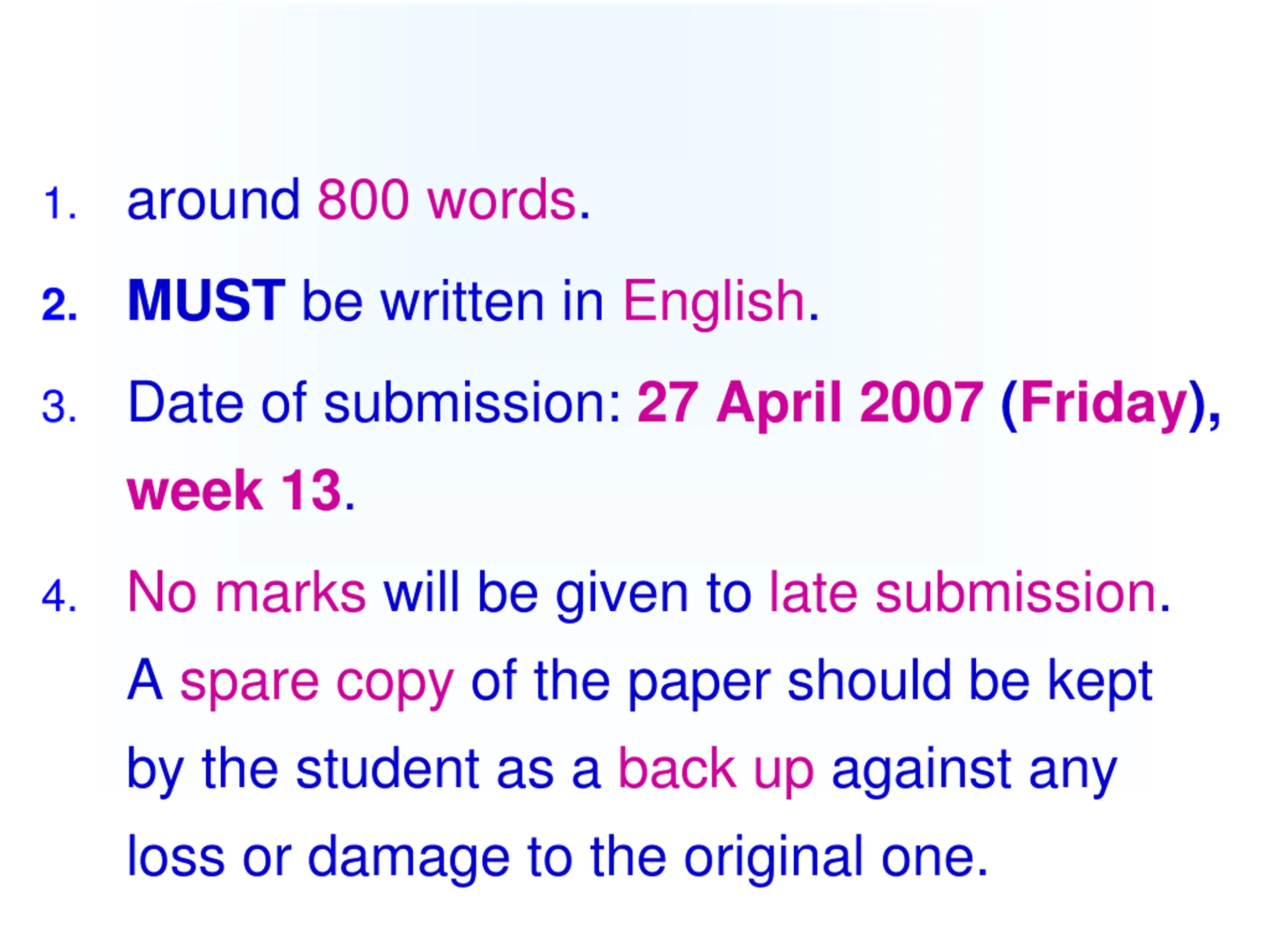 1. around 800 words. 2. MUST be written in English. 3. Date of submission: 27 April 2007 (Friday), week 13. 4. No marks will be given to late submission. A spare copy of the paper should be kept by the student as a back up against any loss or damage to the original one.