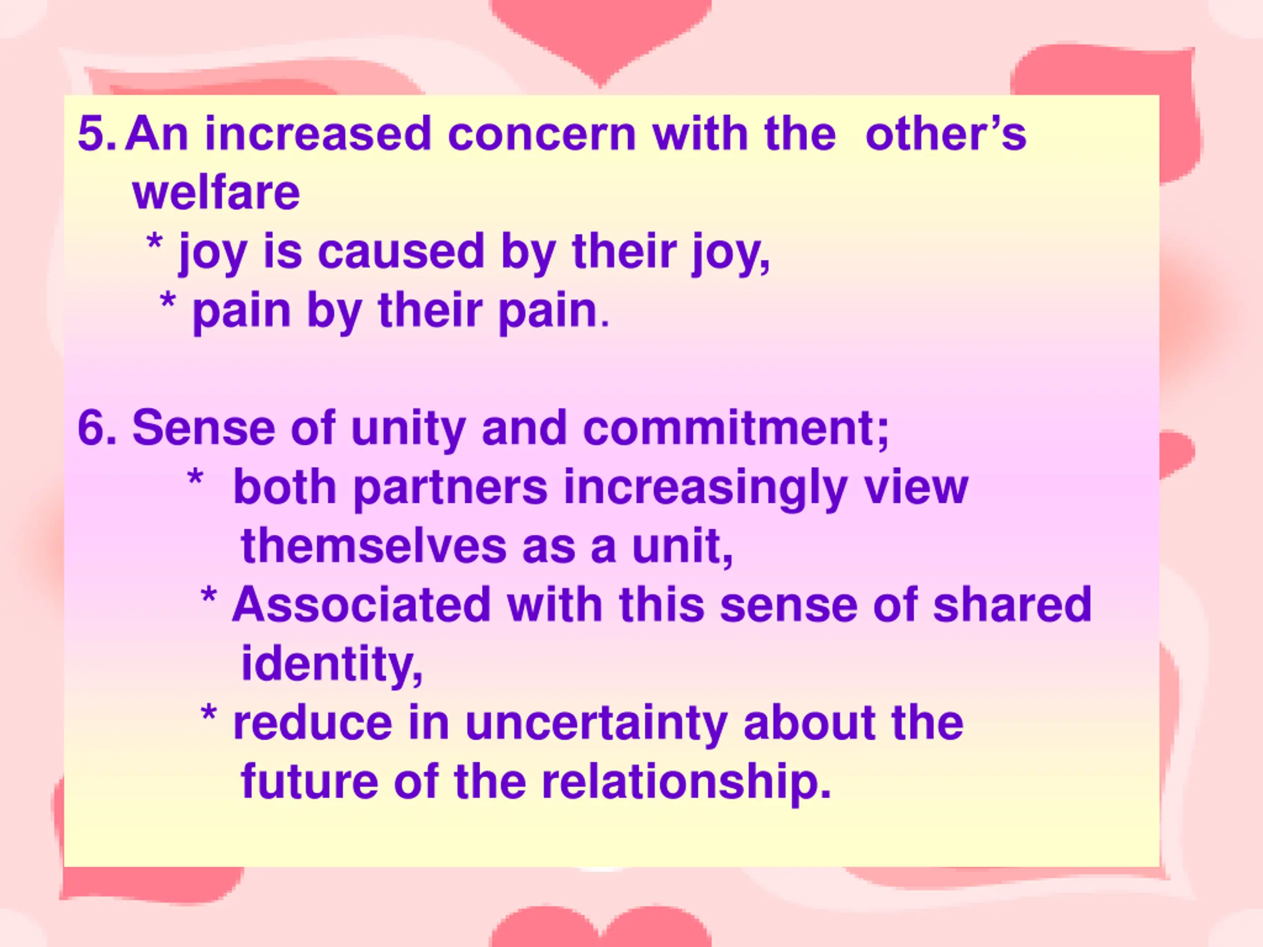 5.An increased concern with the others welfare * joy is caused by their joy, * pain by their pain. 6. Sense of unity and commitment; * both partners increasingly view themselves as a unit, * Associated with this sense of shared identity, * reduce in uncertainty about the future of the relationship.