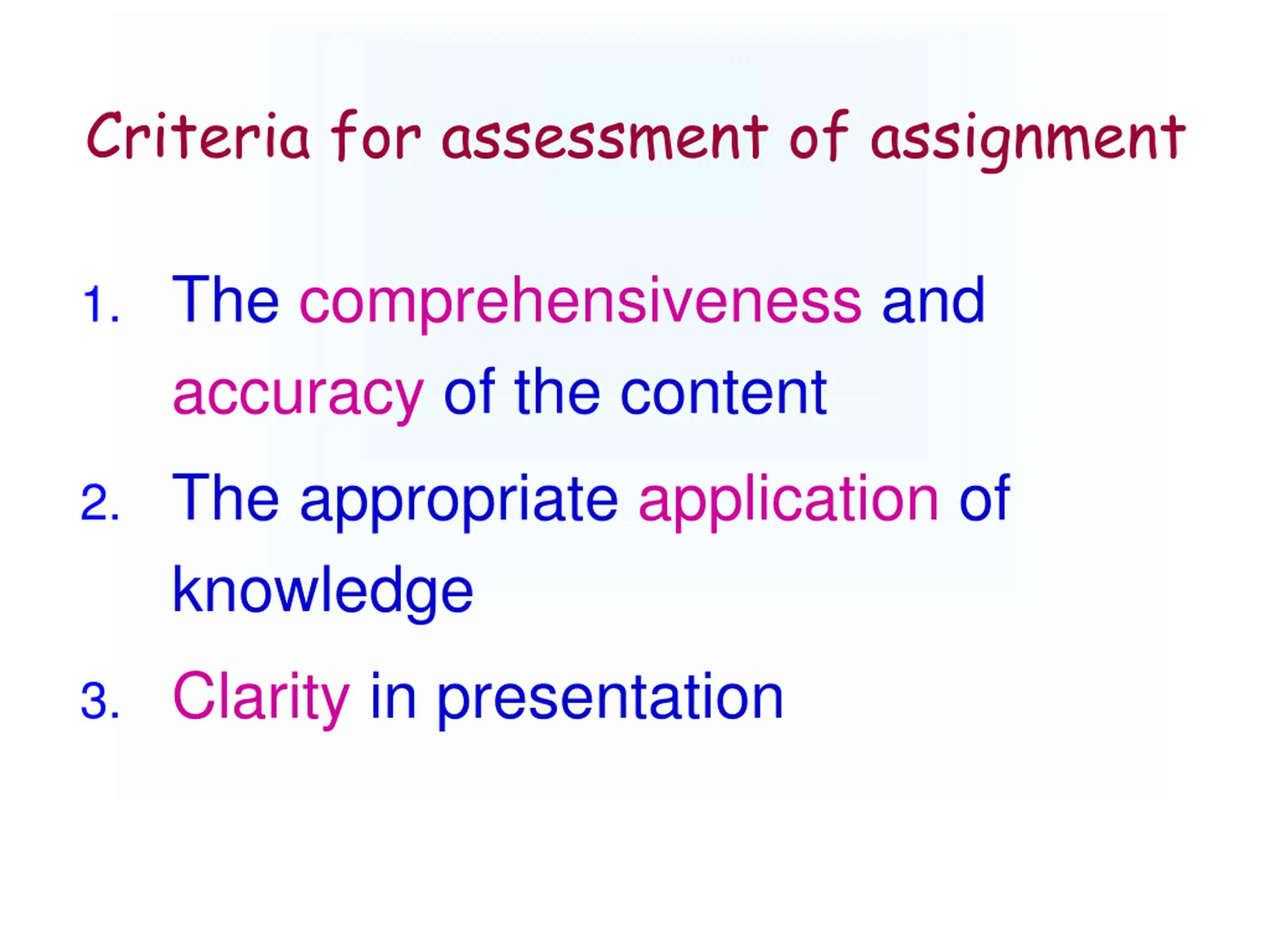 Criteria for assessment of assignment 1. The comprehensiveness and accuracy of the content 2. The appropriate application of knowledge 3. Clarity in presentation