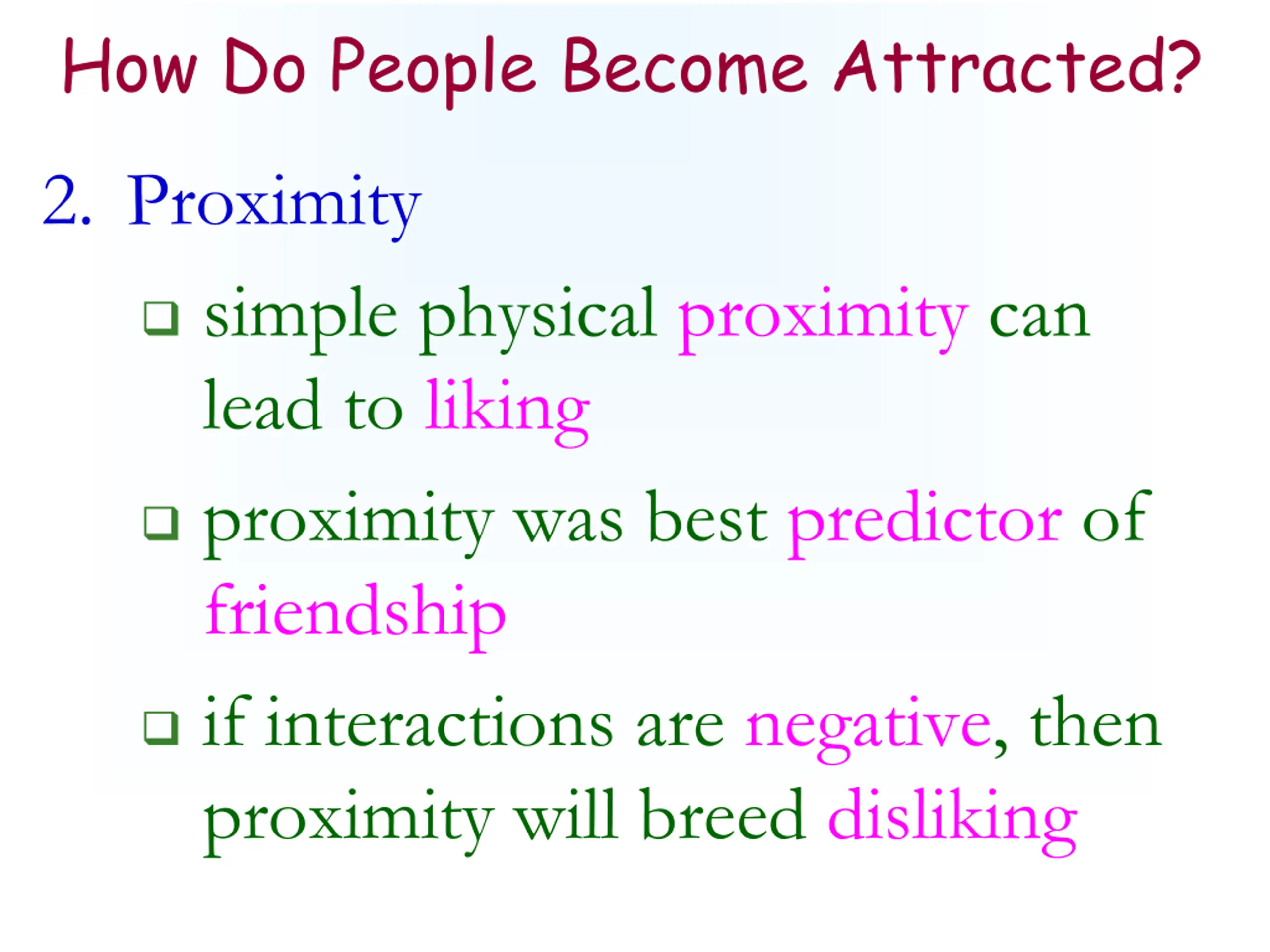 How Do People Become Attracted? 2. Proximity simple physical proximity can lead to liking proximity was best predictor of friendship if interactions are negative, then proximity will breed disliking