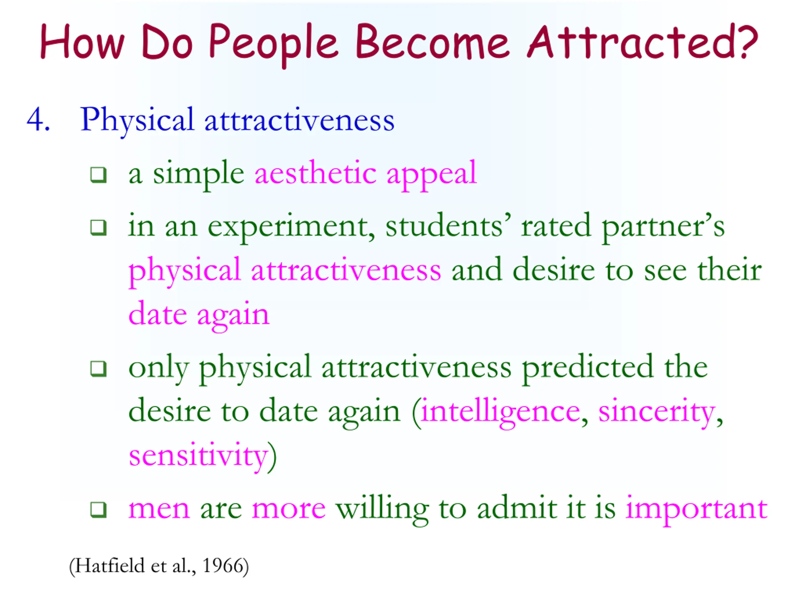 How Do People Become Attracted? 4. Physical attractiveness a simple aesthetic appeal in an experiment, students rated partner s physical attractiveness and desire to see their date again only physical attractiveness predicted the desire to date again (intelligence, sincerity, sensitivity) men are more willing to admit it is important (Hatfield et al., 1966)
