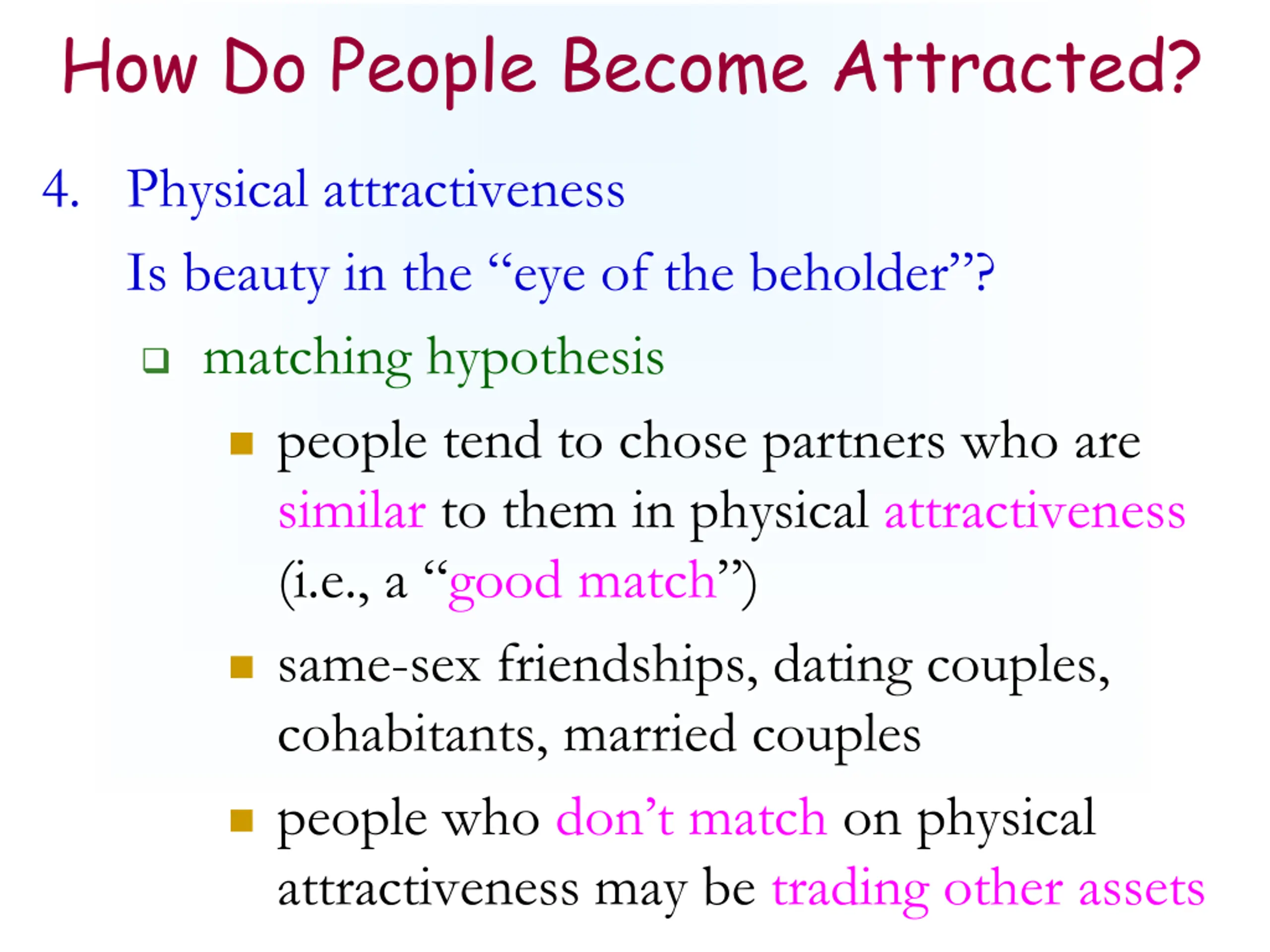 How Do People Become Attracted? 4. Physical attractiveness Is beauty in the eye of the beholder ? matching hypothesis people tend to chose partners who are similar to them in physical attractiveness (i.e., a good match ) same-sex friendships, dating couples, cohabitants, married couples people who don t match on physical attractiveness may be trading other assets