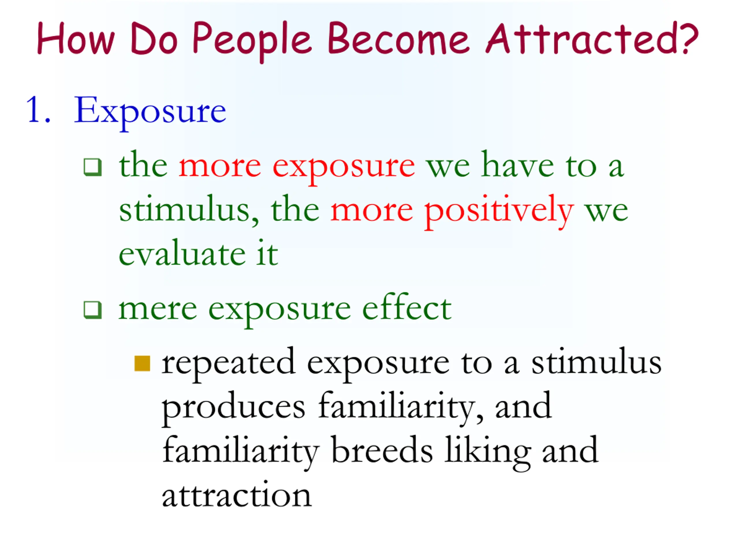How Do People Become Attracted? 1. Exposure the more exposure we have to a stimulus, the more positively we evaluate it mere exposure effect repeated exposure to a stimulus produces familiarity, and familiarity breeds liking and attraction
