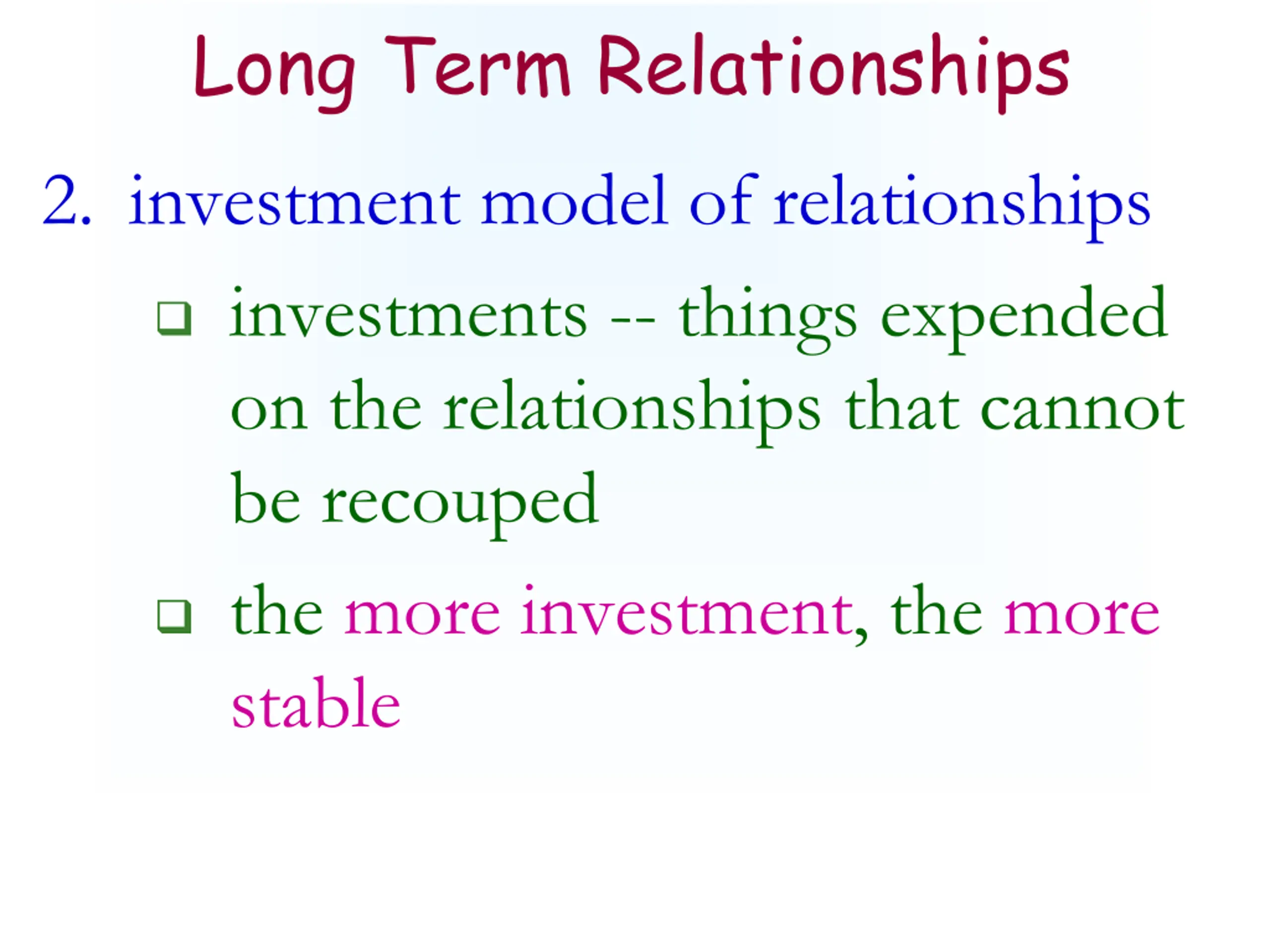 Long Term Relationships 2. investment model of relationships investments -- things expended on the relationships that cannot be recouped the more investment, the more stable
