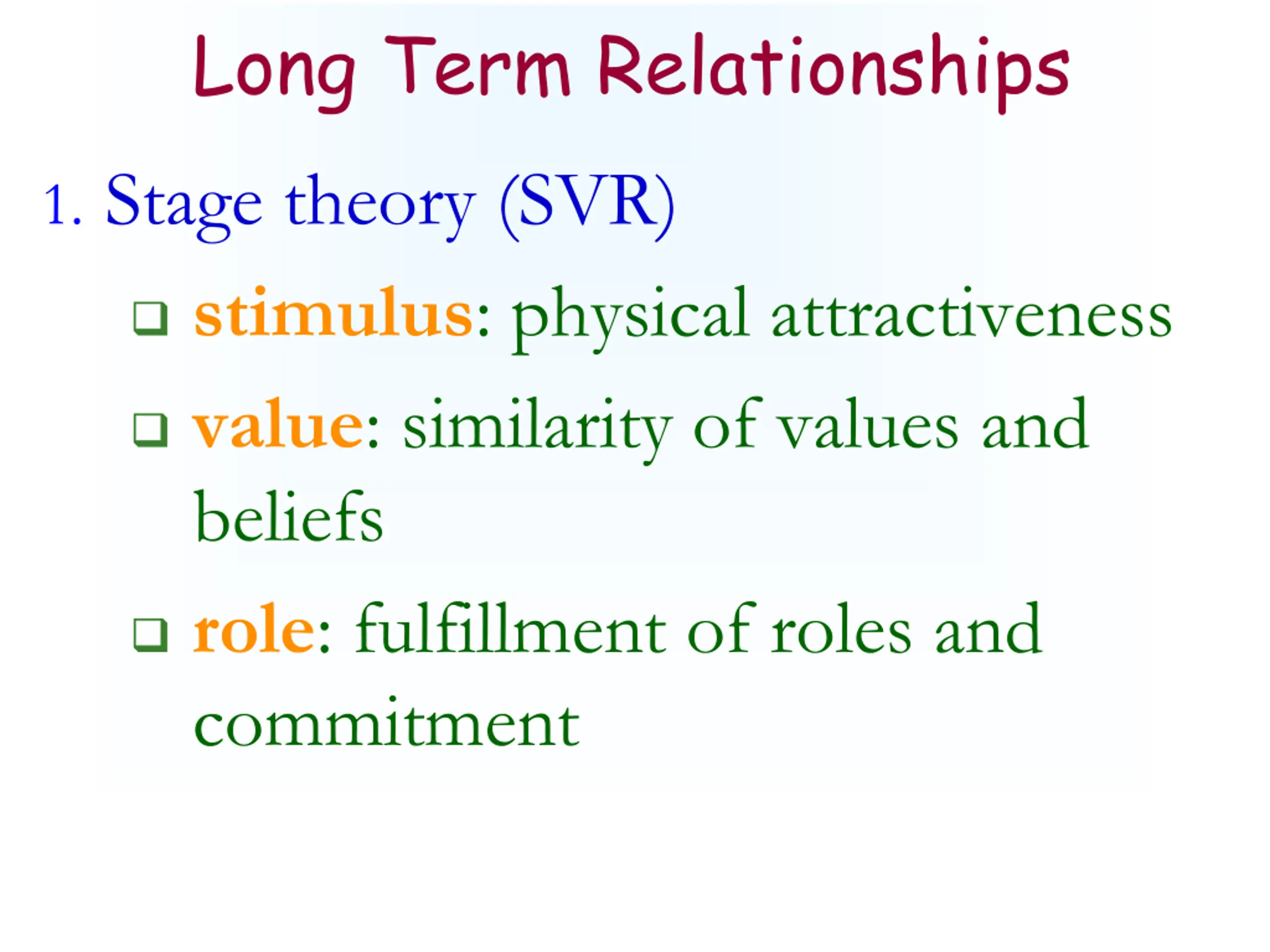 Long Term Relationships 1. Stage theory (SVR) stimulus: physical attractiveness value: similarity of values and beliefs role: fulfillment of roles and commitment