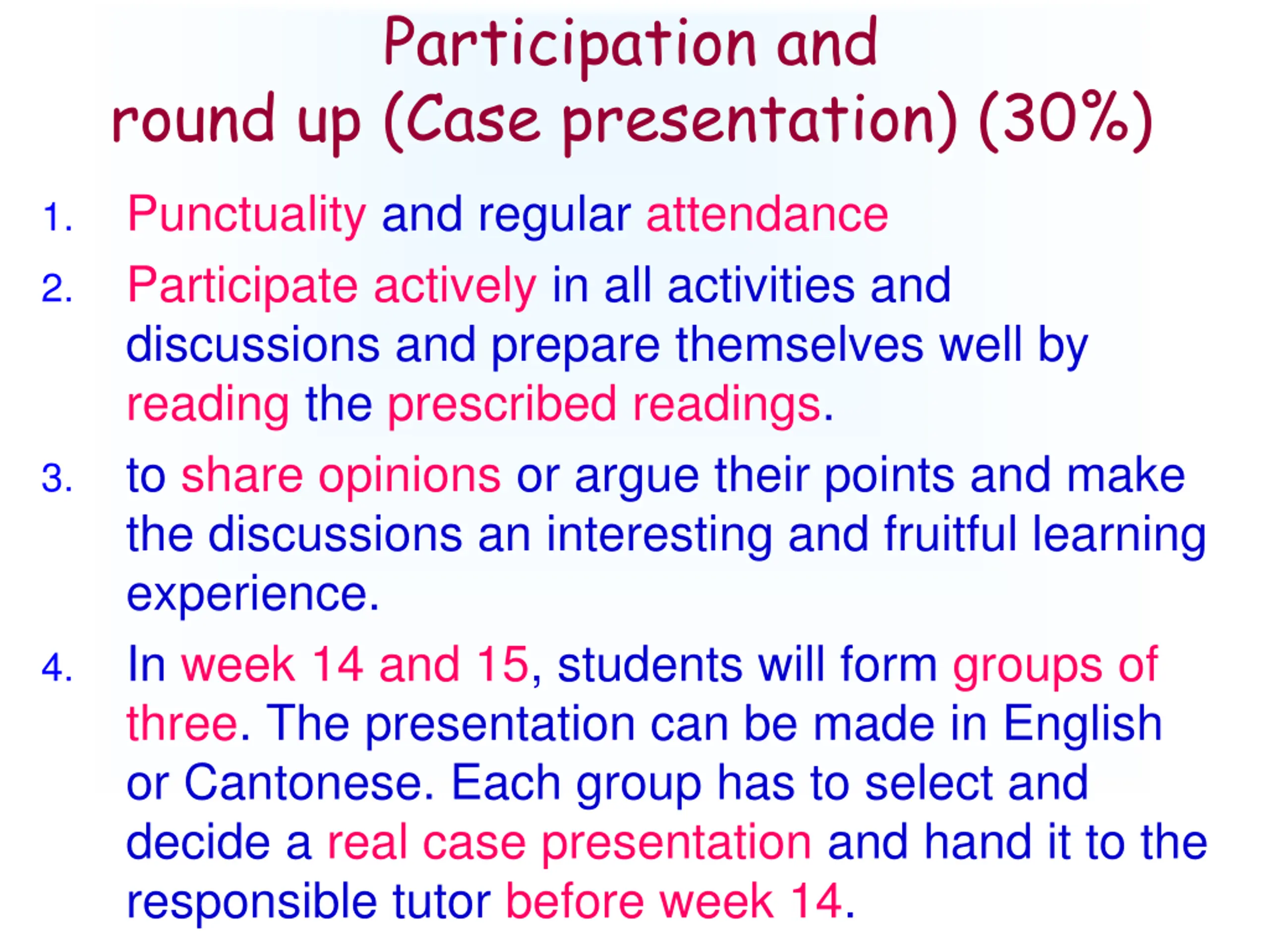 Participation and round up (Case presentation) (30%) Punctuality and regular attendance Participate actively in all activities and discussions and prepare themselves well by reading the prescribed readings. to share opinions or argue their points and make the discussions an interesting and fruitful learning experience. In week 14 and 15, students will form groups of three. The presentation can be made in English or Cantonese. Each group has to select and decide a real case presentation and hand it to the responsible tutor before week 14. 1. 2. 3. 4.
