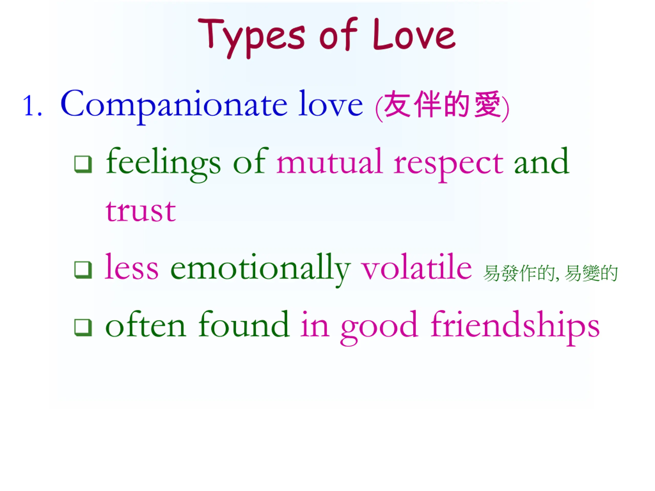 Types of Love 1. Companionate love ( ) feelings of mutual respect and trust less emotionally volatile , often found in good friendships