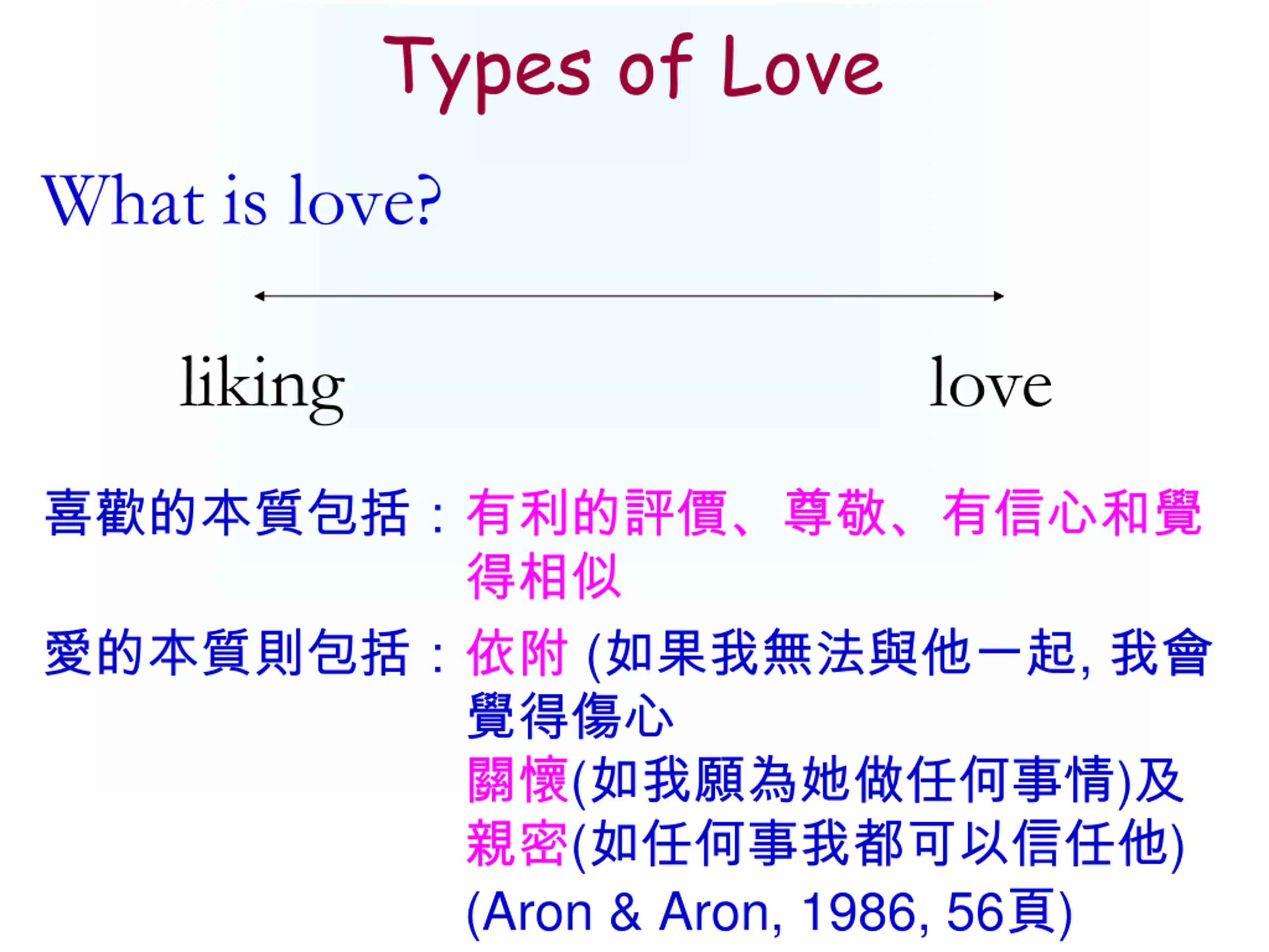 Types of Love What is love? liking love ( , ( ) ( ) (Aron & Aron, 1986, 56 )