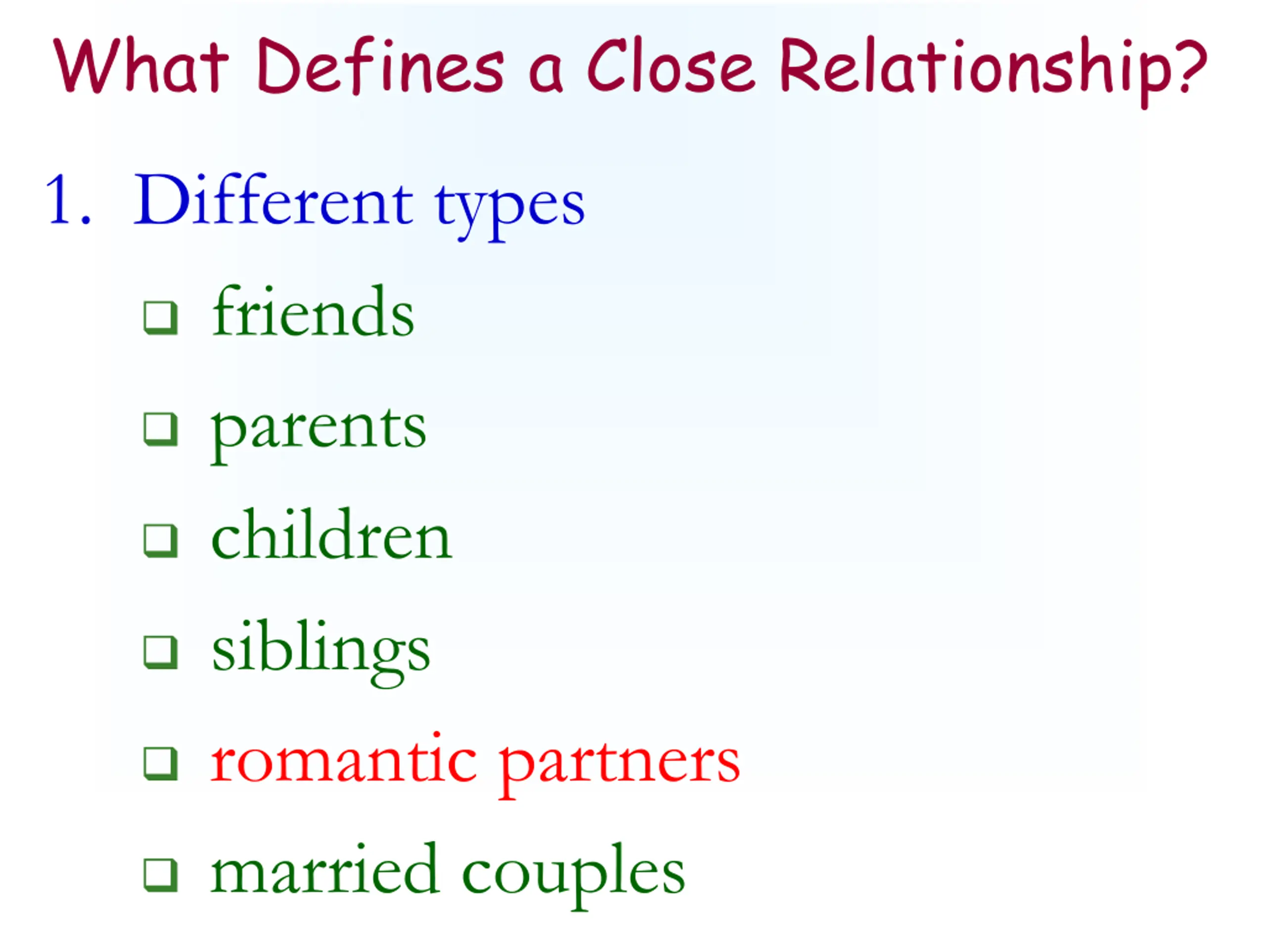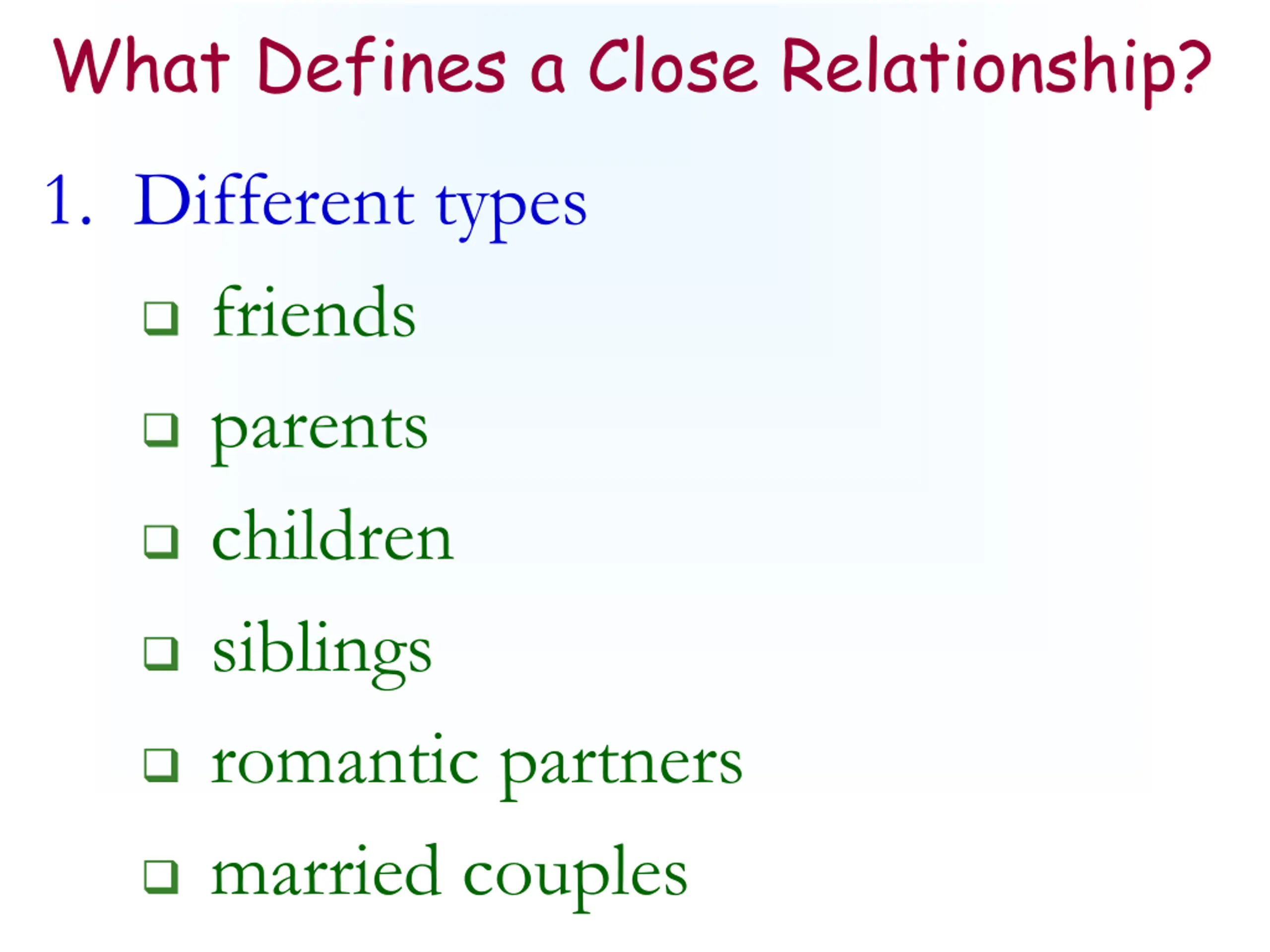 What Defines a Close Relationship? 1. Different types friends parents children siblings romantic partners married couples