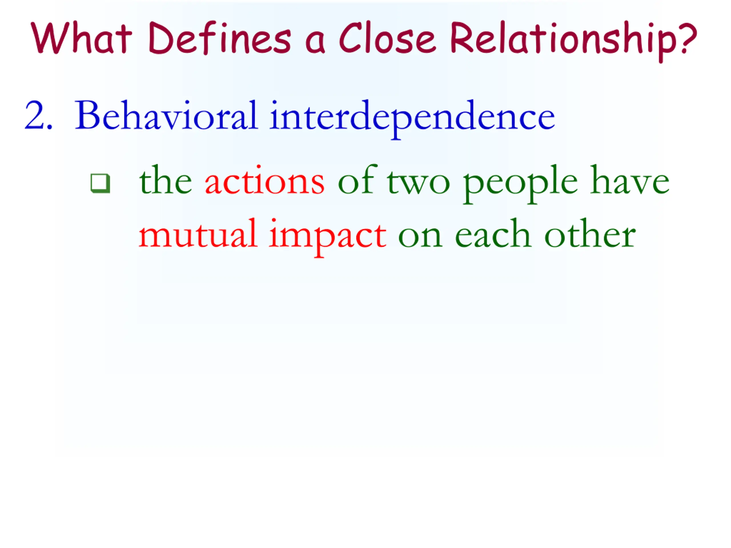 What Defines a Close Relationship? 2. Behavioral interdependence the actions of two people have mutual impact on each other