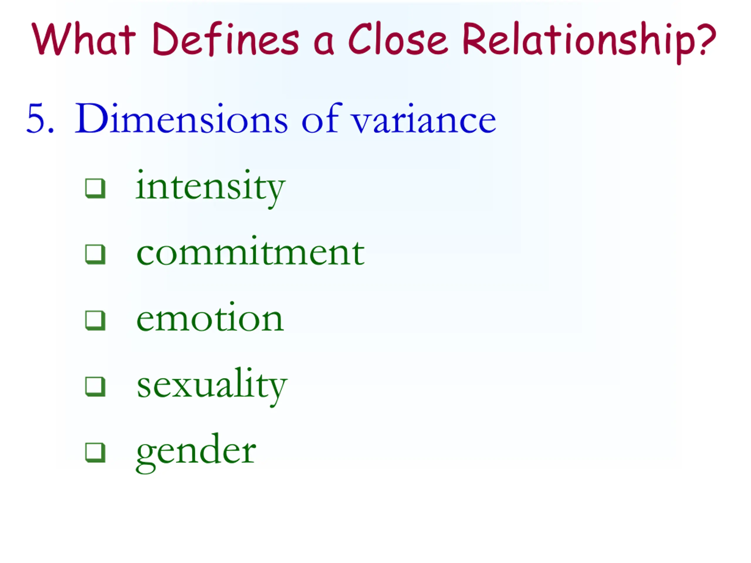 What Defines a Close Relationship? 5. Dimensions of variance intensity commitment emotion sexuality gender