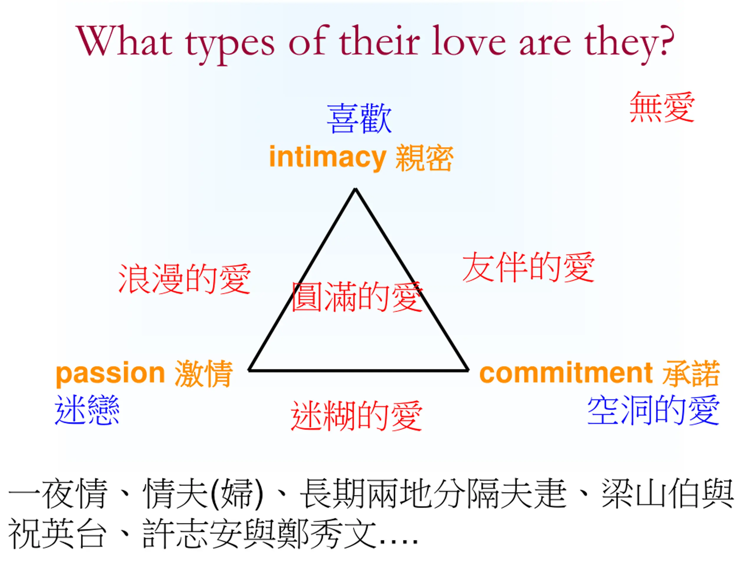 What types of their love are they? intimacy passion commitment ( ) .