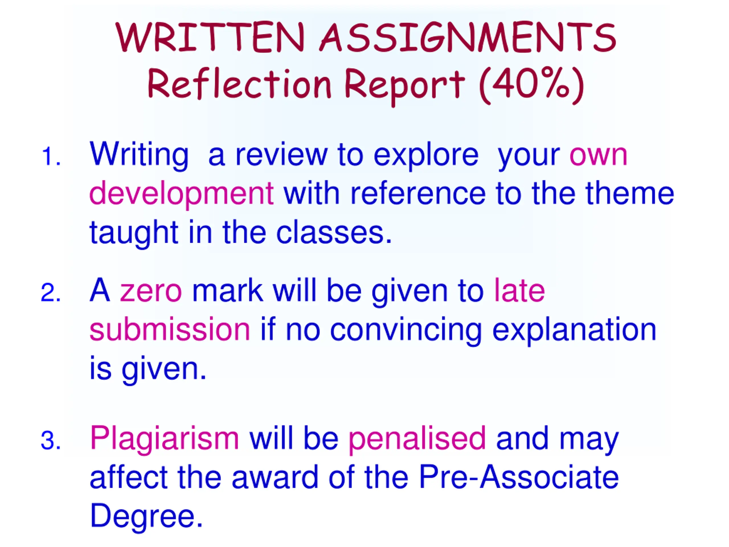 WRITTEN ASSIGNMENTS Reflection Report (40%) 1. Writing a review to explore your own development with reference to the theme taught in the classes. 2. A zero mark will be given to late submission if no convincing explanation is given. 3. Plagiarism will be penalised and may affect the award of the Pre-Associate Degree.