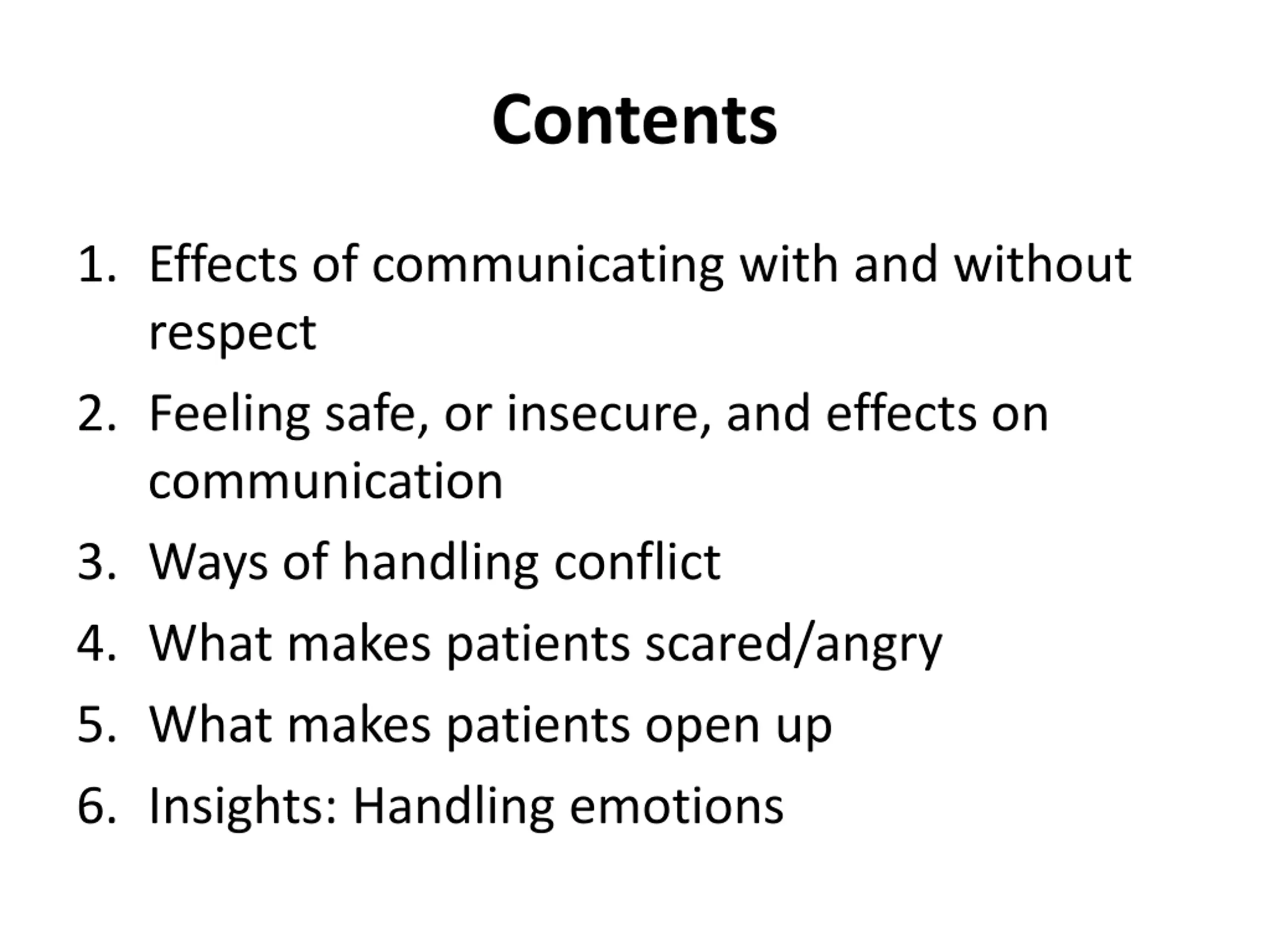 Contents 1. Effects of communicating with and without respect 2. Feeling safe, or insecure, and effects on communication 3. Ways of handling conflict 4. What makes patients scared/angry 5. What makes patients open up 6. Insights: Handling emotions