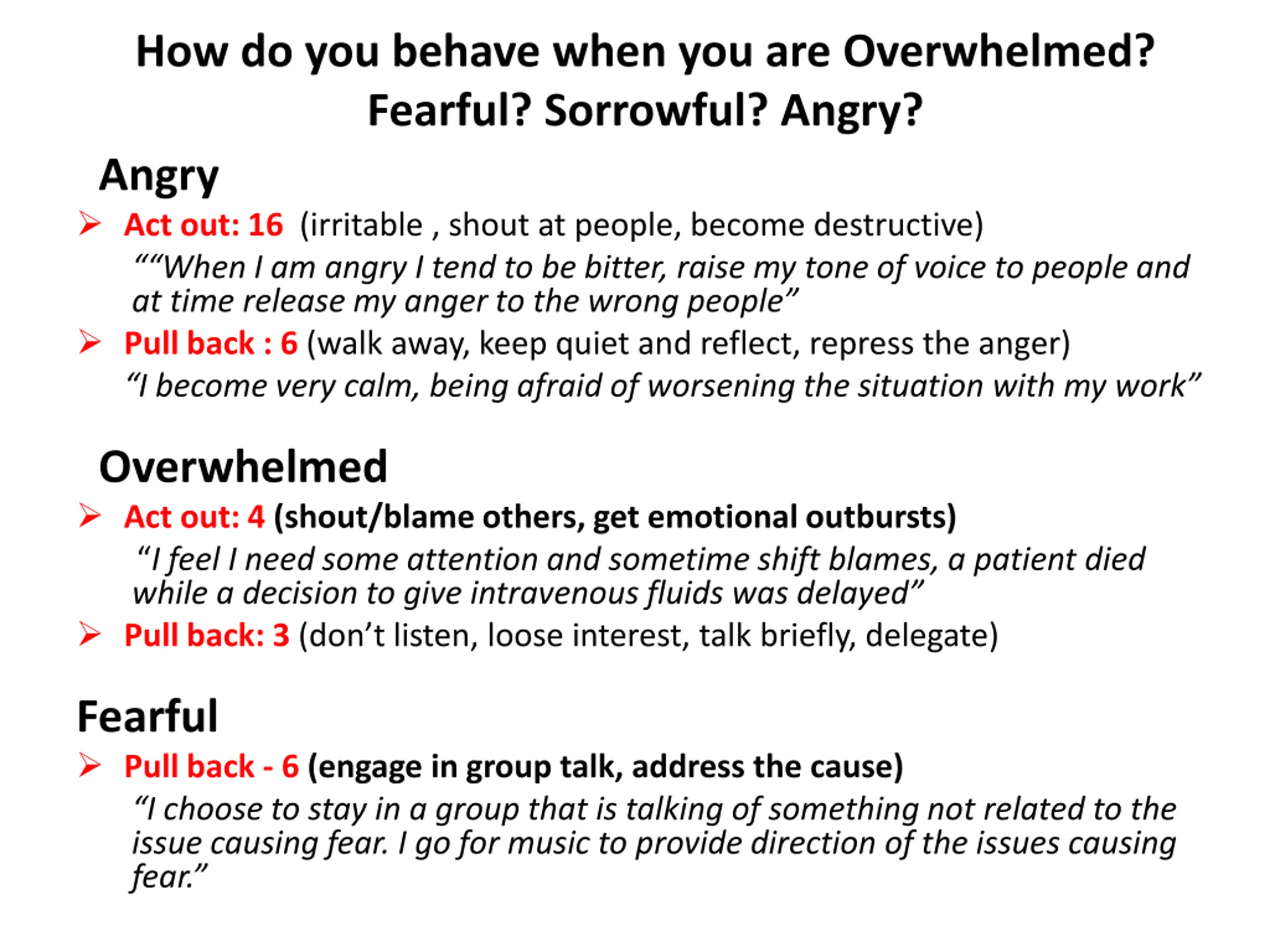 How do you behave when you are Overwhelmed? Fearful? Sorrowful? Angry? Angry Act out: 16 (irritable , shout at people, become destructive) When I am angry I tend to be bitter, raise my tone of voice to people and at time release my anger to the wrong people Pull back : 6 (walk away, keep quiet and reflect, repress the anger) I become very calm, being afraid of worsening the situation with my work Overwhelmed Act out: 4 (shout/blame others, get emotional outbursts) I feel I need some attention and sometime shift blames, a patient died while a decision to give intravenous fluids was delayed Pull back: 3 (don t listen, loose interest, talk briefly, delegate) Fearful Pull back - 6 (engage in group talk, address the cause) I choose to stay in a group that is talking of something not related to the issue causing fear. I go for music to provide direction of the issues causing fear.