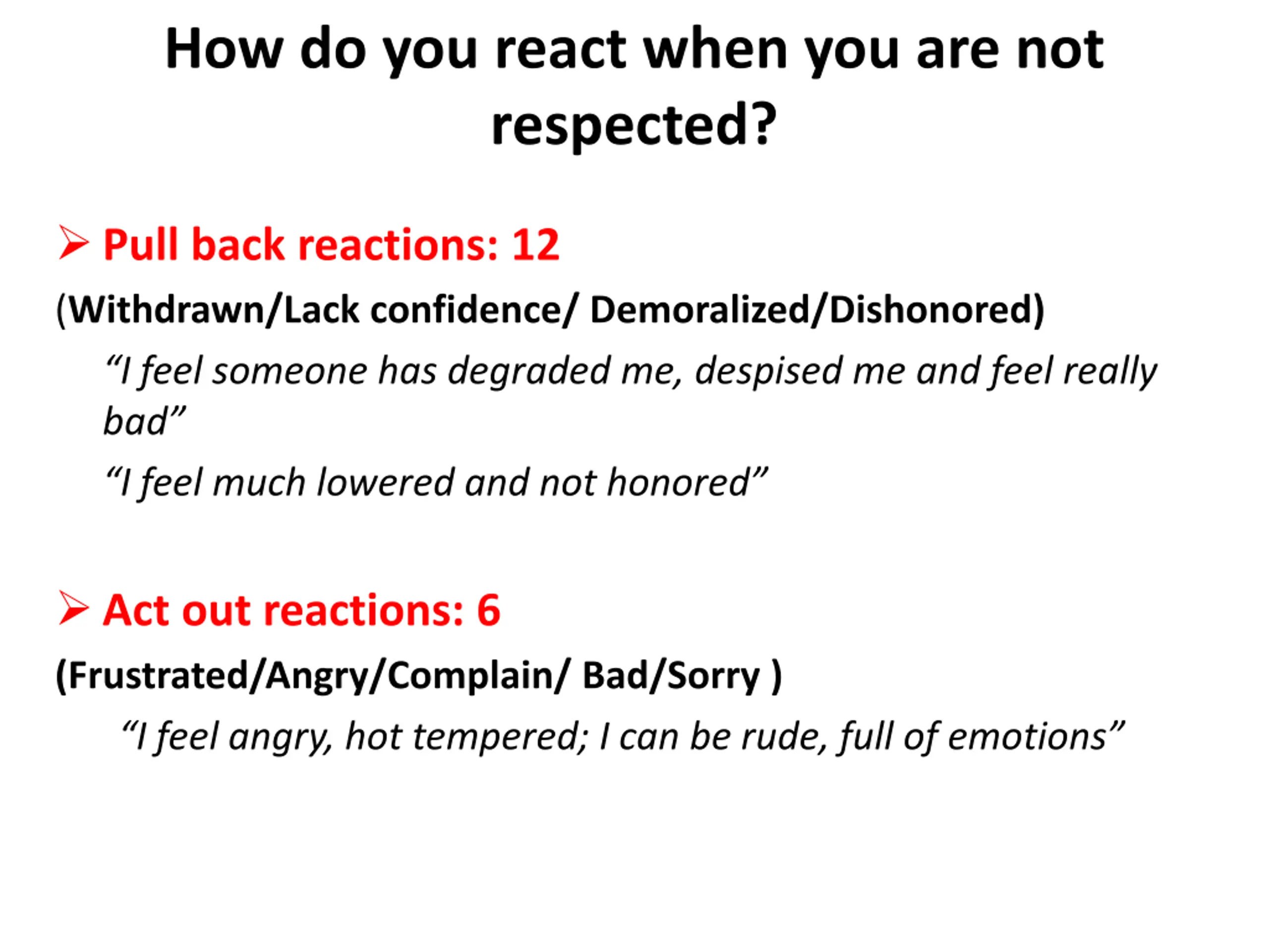How do you react when you are not respected? Pull back reactions: 12 (Withdrawn/Lack confidence/ Demoralized/Dishonored) I feel someone has degraded me, despised me and feel really bad I feel much lowered and not honored Act out reactions: 6 (Frustrated/Angry/Complain/ Bad/Sorry ) I feel angry, hot tempered; I can be rude, full of emotions