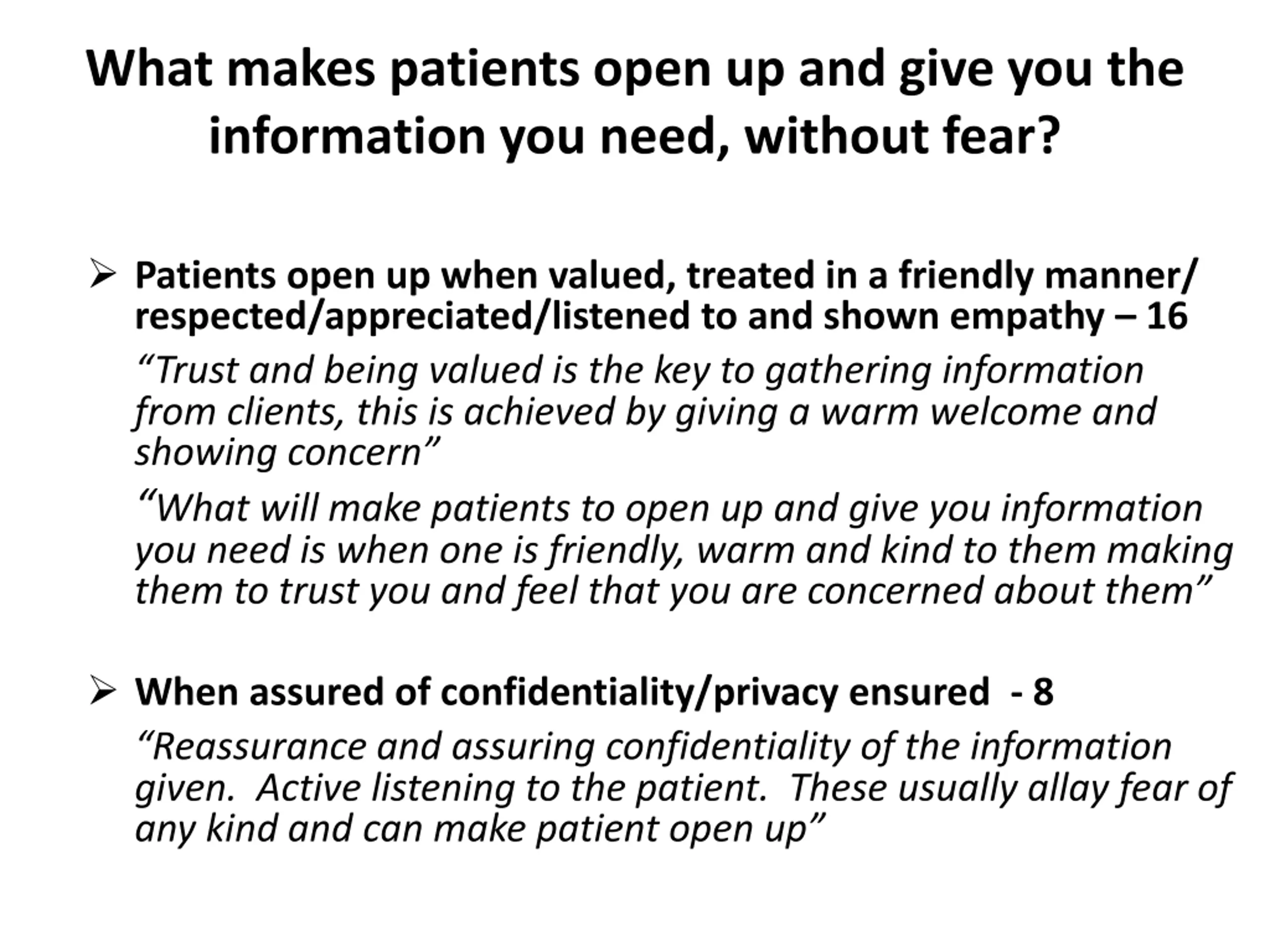 What makes patients open up and give you the information you need, without fear? Patients open up when valued, treated in a friendly manner/ respected/appreciated/listened to and shown empathy 16 Trust and being valued is the key to gathering information from clients, this is achieved by giving a warm welcome and showing concern What will make patients to open up and give you information you need is when one is friendly, warm and kind to them making them to trust you and feel that you are concerned about them When assured of confidentiality/privacy ensured - 8 Reassurance and assuring confidentiality of the information given. Active listening to the patient. These usually allay fear of any kind and can make patient open up