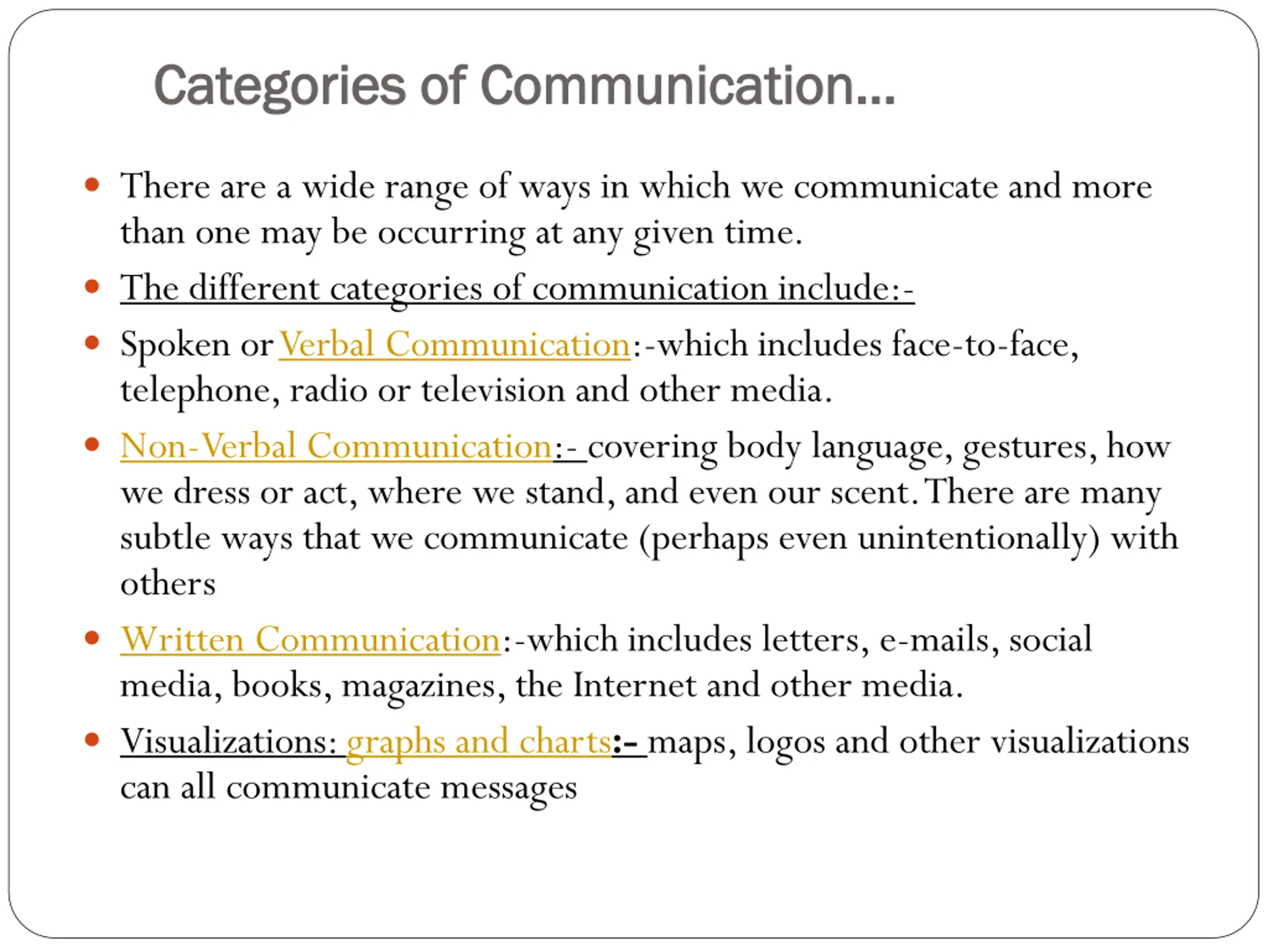 Categories of Communication Categories of Communication There are a wide range of ways in which we communicate and more than one may be occurring at any given time. The different categories of communication include:- Spoken orVerbal Communication:-which includes face-to-face, telephone, radio or television and other media. Non-Verbal Communication:-covering body language, gestures, how we dress or act, where we stand, and even our scent. There are many subtle ways that we communicate (perhaps even unintentionally) with others Written Communication:-which includes letters, e-mails, social media, books, magazines, the Internet and other media. Visualizations:graphs and charts:- maps, logos and other visualizations can all communicate messages