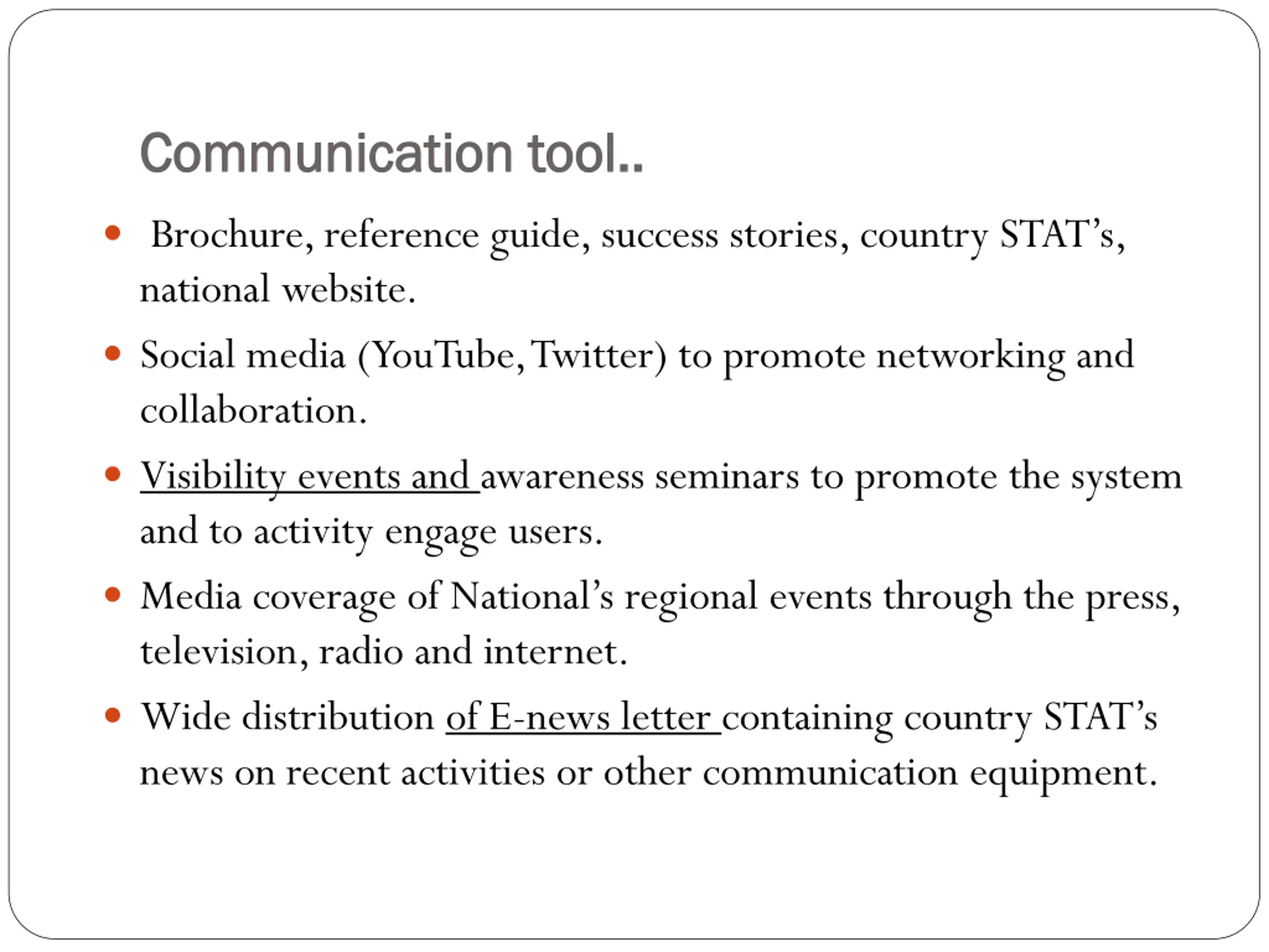 Communication tool.. Communication tool.. Brochure, reference guide, success stories, country STAT s, national website. Social media (YouTube, Twitter) to promote networking and collaboration. Visibility events and awareness seminars to promote the system and to activity engage users. Media coverage of National s regional events through the press, television, radio and internet. Wide distribution of E-news letter containing country STAT s news on recent activities or other communication equipment.