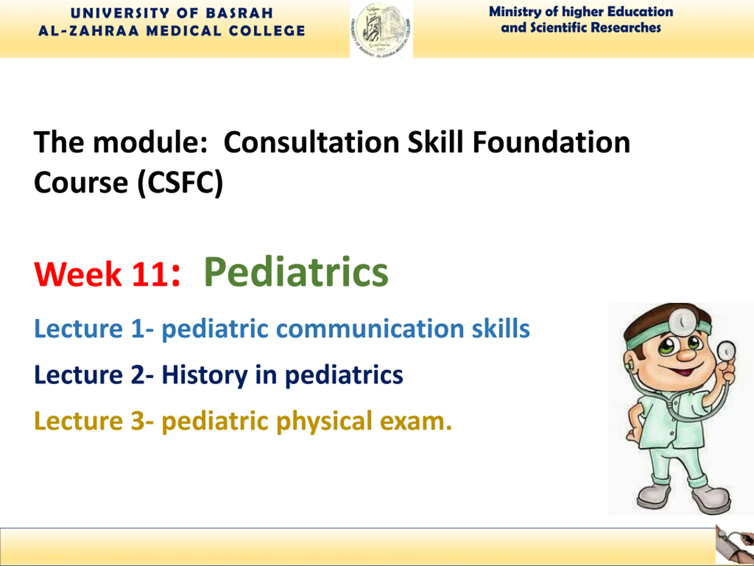 Ministry of higher Education and Scientific Researches UNIVERSITY OF BASRAH AL-ZAHRAA MEDICAL COLLEGE The module: Consultation Skill Foundation Course (CSFC) Week 11: Pediatrics Lecture 1- pediatric communication skills Lecture 2- History in pediatrics Lecture 3- pediatric physical exam.