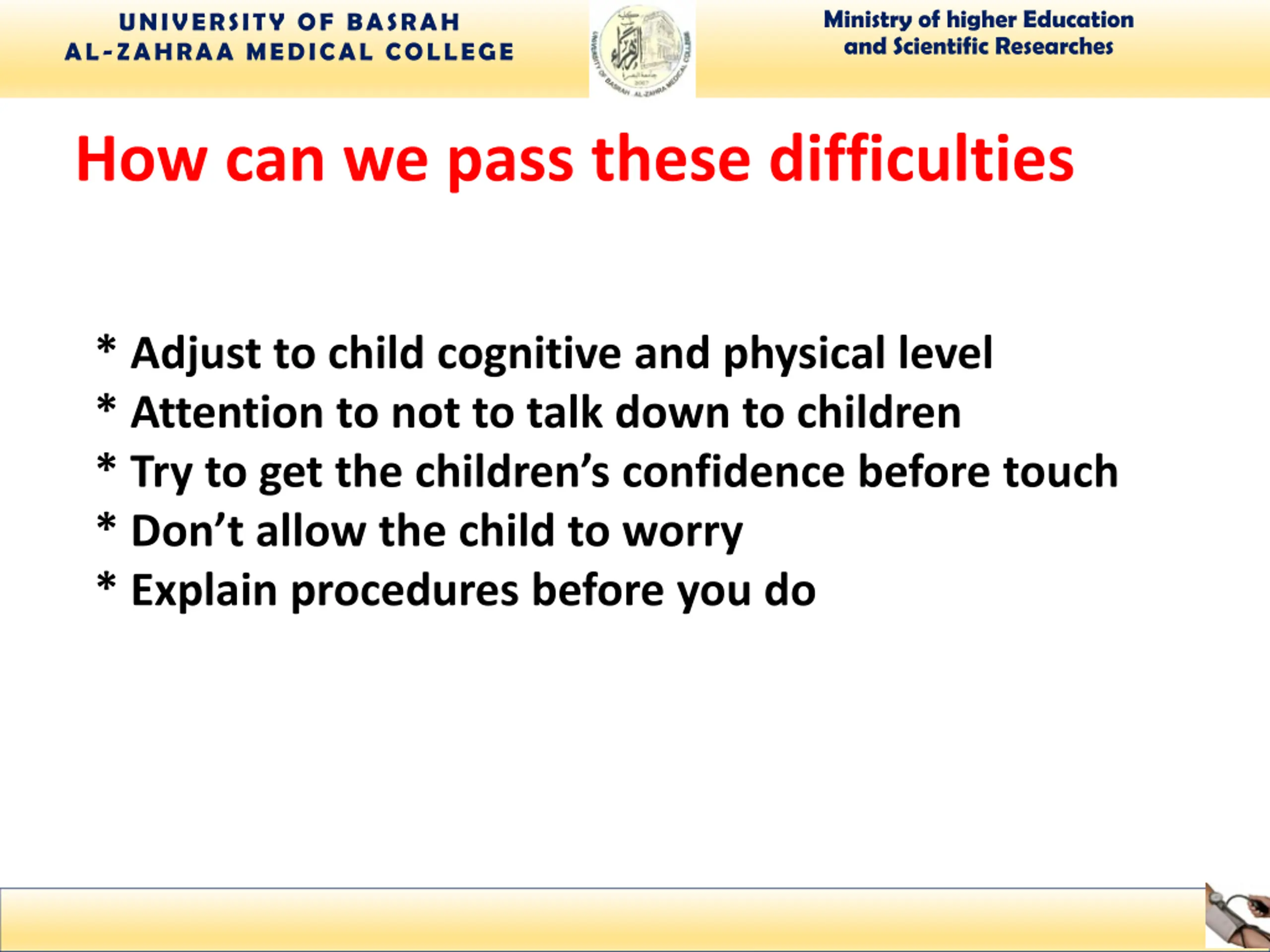Ministry of higher Education and Scientific Researches UNIVERSITY OF BASRAH AL-ZAHRAA MEDICAL COLLEGE How can we pass these difficulties * Adjust to child cognitive and physical level * Attention to not to talk down to children * Try to get the children s confidence before touch * Don t allow the child to worry * Explain procedures before you do