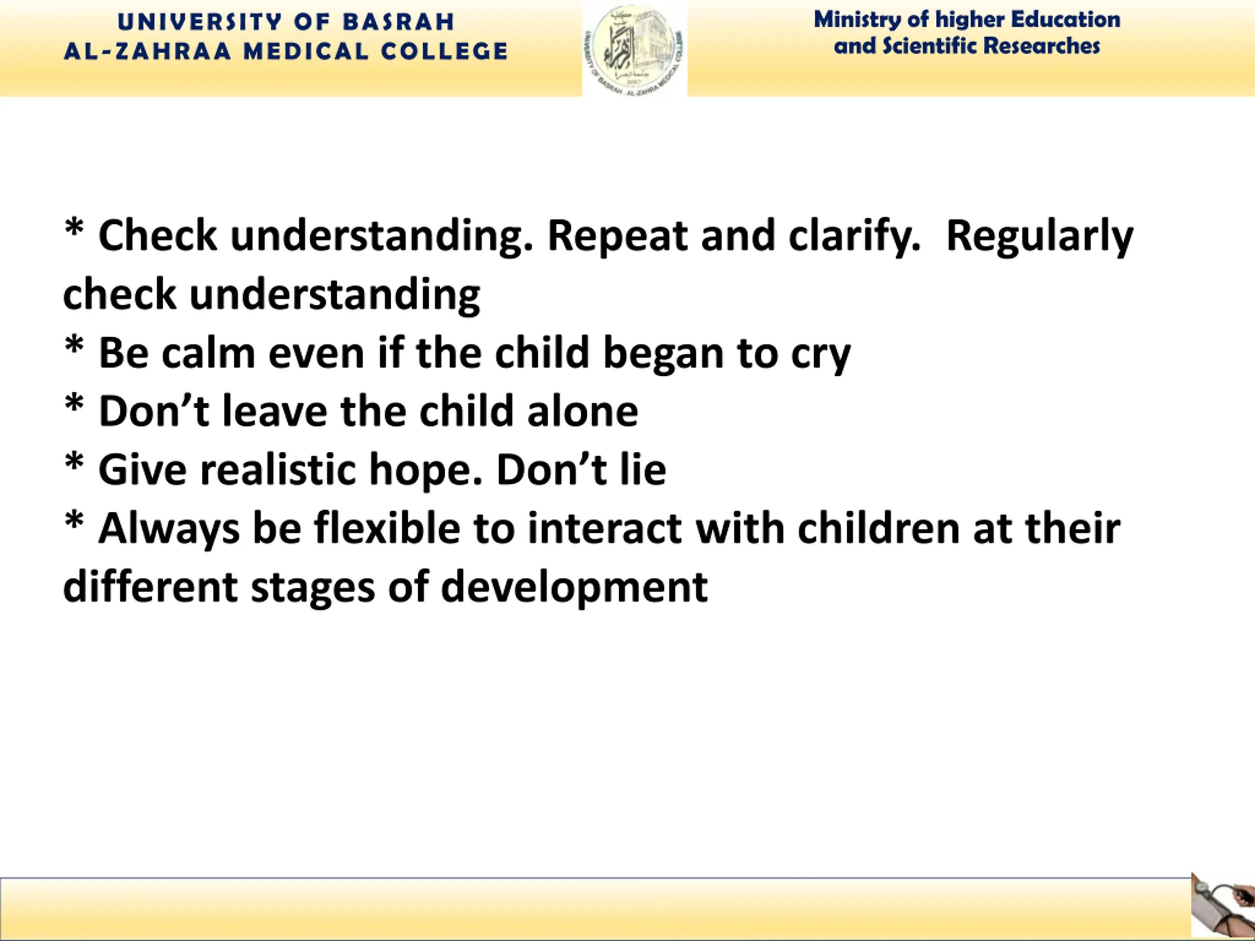 Ministry of higher Education and Scientific Researches UNIVERSITY OF BASRAH AL-ZAHRAA MEDICAL COLLEGE * Check understanding. Repeat and clarify. Regularly check understanding * Be calm even if the child began to cry * Don t leave the child alone * Give realistic hope. Don t lie * Always be flexible to interact with children at their different stages of development