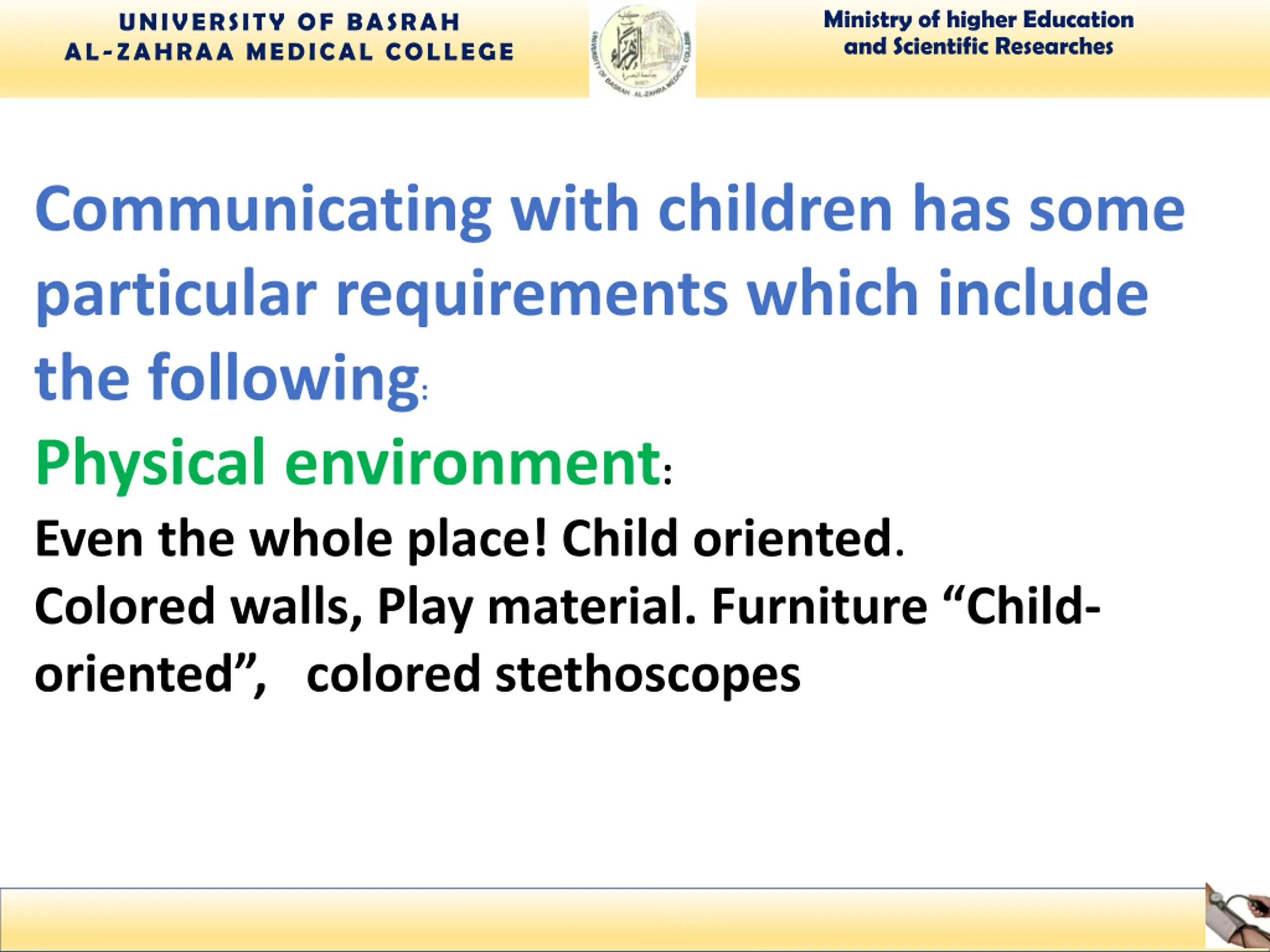 Ministry of higher Education and Scientific Researches UNIVERSITY OF BASRAH AL-ZAHRAA MEDICAL COLLEGE Communicating with children has some particular requirements which include the following: Physical environment: Even the whole place! Child oriented. Colored walls, Play material. Furniture Child- oriented , colored stethoscopes