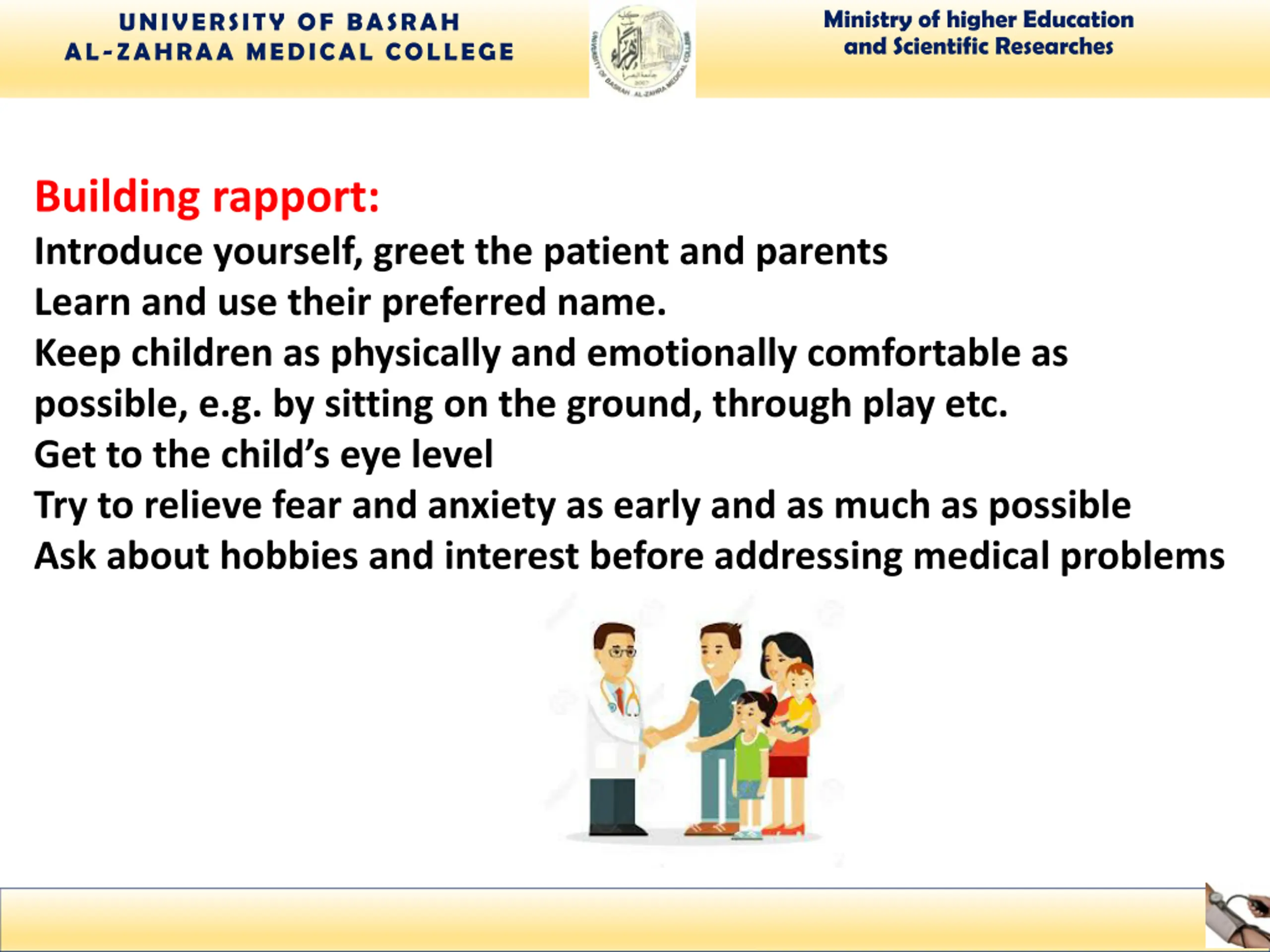 Ministry of higher Education and Scientific Researches UNIVERSITY OF BASRAH AL-ZAHRAA MEDICAL COLLEGE Building rapport: Introduce yourself, greet the patient and parents Learn and use their preferred name. Keep children as physically and emotionally comfortable as possible, e.g. by sitting on the ground, through play etc. Get to the child s eye level Try to relieve fear and anxiety as early and as much as possible Ask about hobbies and interest before addressing medical problems
