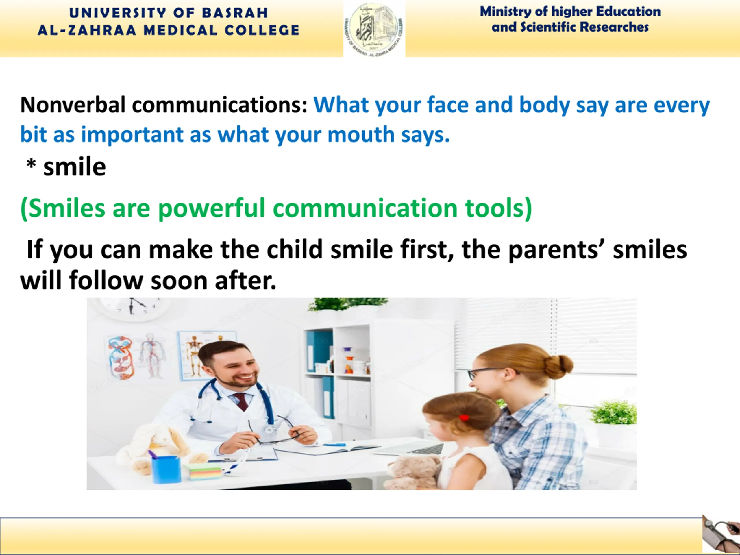 Ministry of higher Education and Scientific Researches UNIVERSITY OF BASRAH AL-ZAHRAA MEDICAL COLLEGE Nonverbal communications: What your face and body say are every bit as important as what your mouth says. * smile (Smiles are powerful communication tools) If you can make the child smile first, the parents smiles will follow soon after.