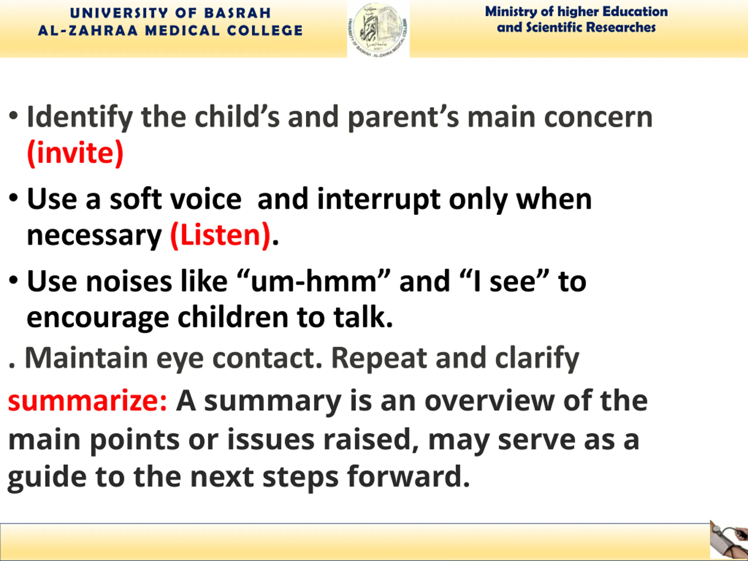 Ministry of higher Education and Scientific Researches UNIVERSITY OF BASRAH AL-ZAHRAA MEDICAL COLLEGE Identify the child s and parent s main concern (invite) Use a soft voice and interrupt only when necessary (Listen). Use noises like um-hmm and I see to encourage children to talk. . Maintain eye contact. Repeat and clarify summarize:A summary is an overview of the main points or issues raised, may serve as a guide to the next steps forward.