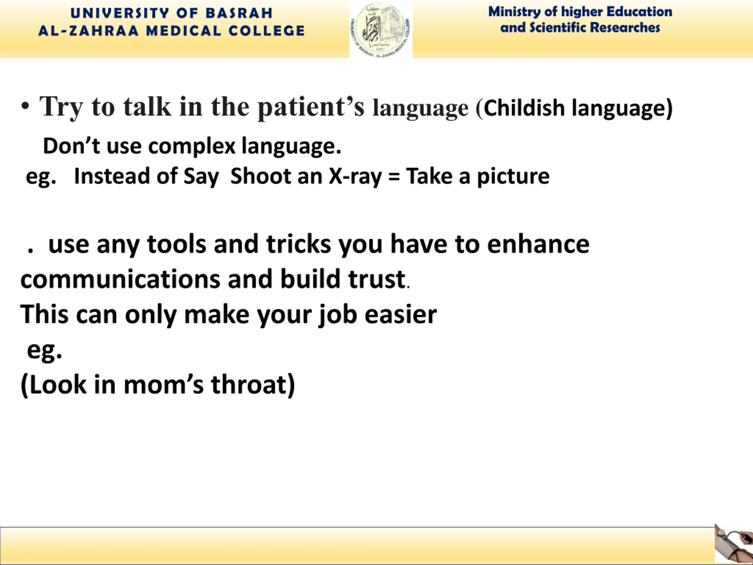 Ministry of higher Education and Scientific Researches UNIVERSITY OF BASRAH AL-ZAHRAA MEDICAL COLLEGE Try to talk in the patient s language (Childish language) Don t use complex language. eg. Instead of Say Shoot an X-ray = Take a picture . use any tools and tricks you have to enhance communications and build trust. This can only make your job easier eg. (Look in mom s throat)