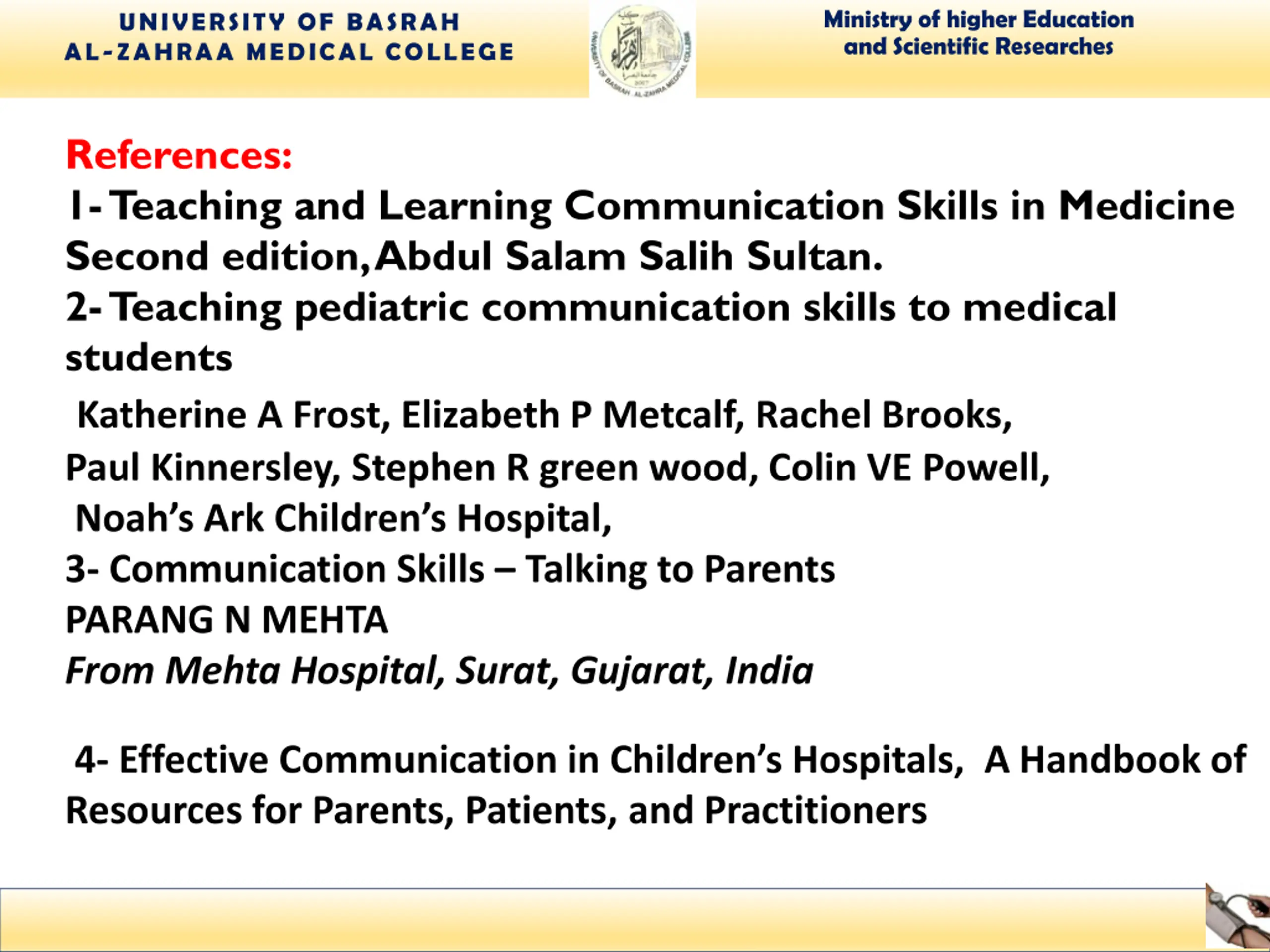 Ministry of higher Education and Scientific Researches UNIVERSITY OF BASRAH AL-ZAHRAA MEDICAL COLLEGE References: 1- Teaching and Learning Communication Skills in Medicine Second edition, Abdul Salam Salih Sultan. 2- Teaching pediatric communication skills to medical students Katherine A Frost, Elizabeth P Metcalf, Rachel Brooks, Paul Kinnersley, Stephen R green wood, Colin VE Powell, Noah s Ark Children s Hospital, 3- Communication Skills Talking to Parents PARANG N MEHTA From Mehta Hospital, Surat, Gujarat, India 4- Effective Communication in Children s Hospitals, A Handbook of Resources for Parents, Patients, and Practitioners