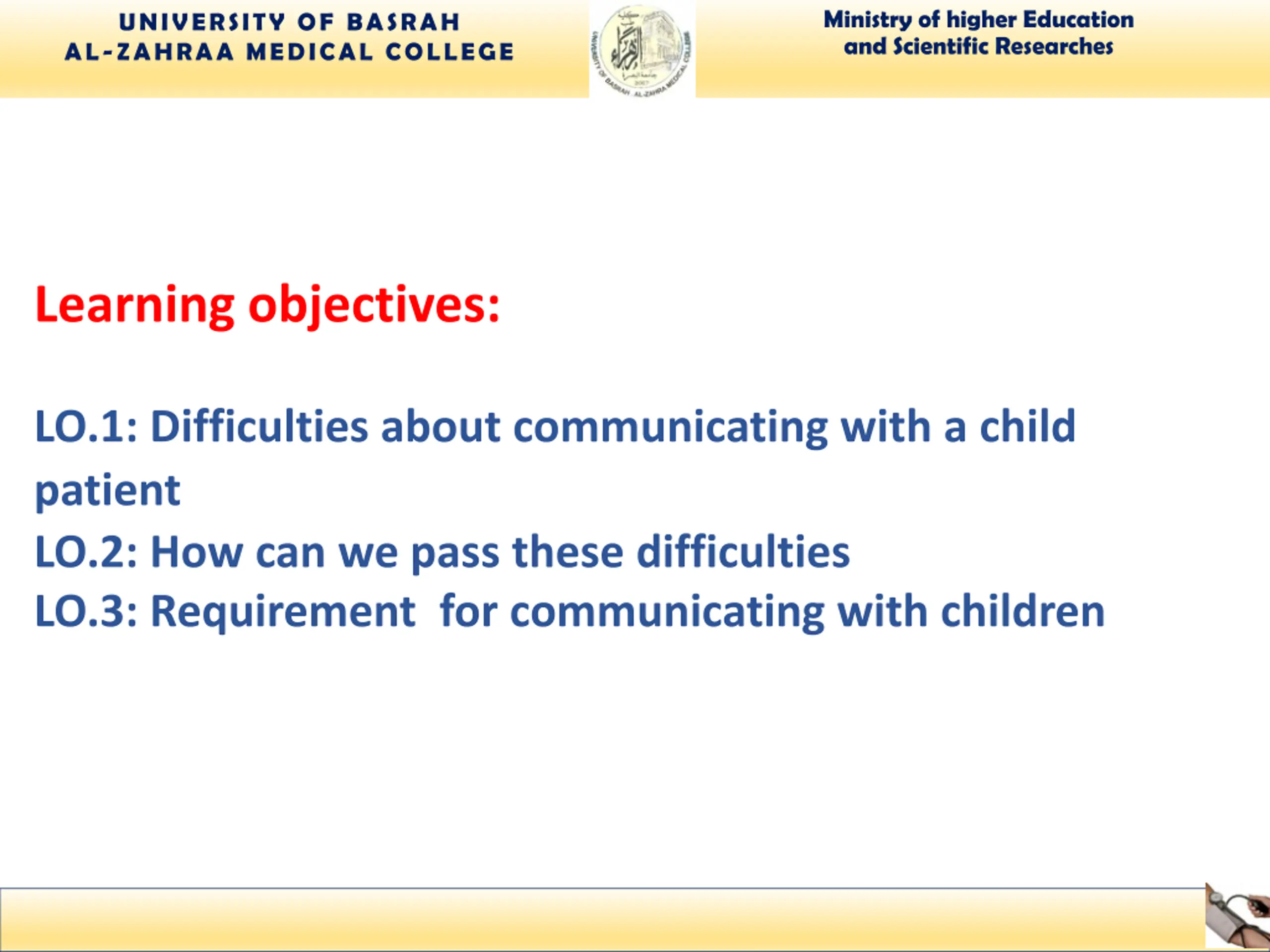 Ministry of higher Education and Scientific Researches UNIVERSITY OF BASRAH AL-ZAHRAA MEDICAL COLLEGE Learning objectives: LO.1: Difficulties about communicating with a child patient LO.2: How can we pass these difficulties LO.3: Requirement for communicating with children