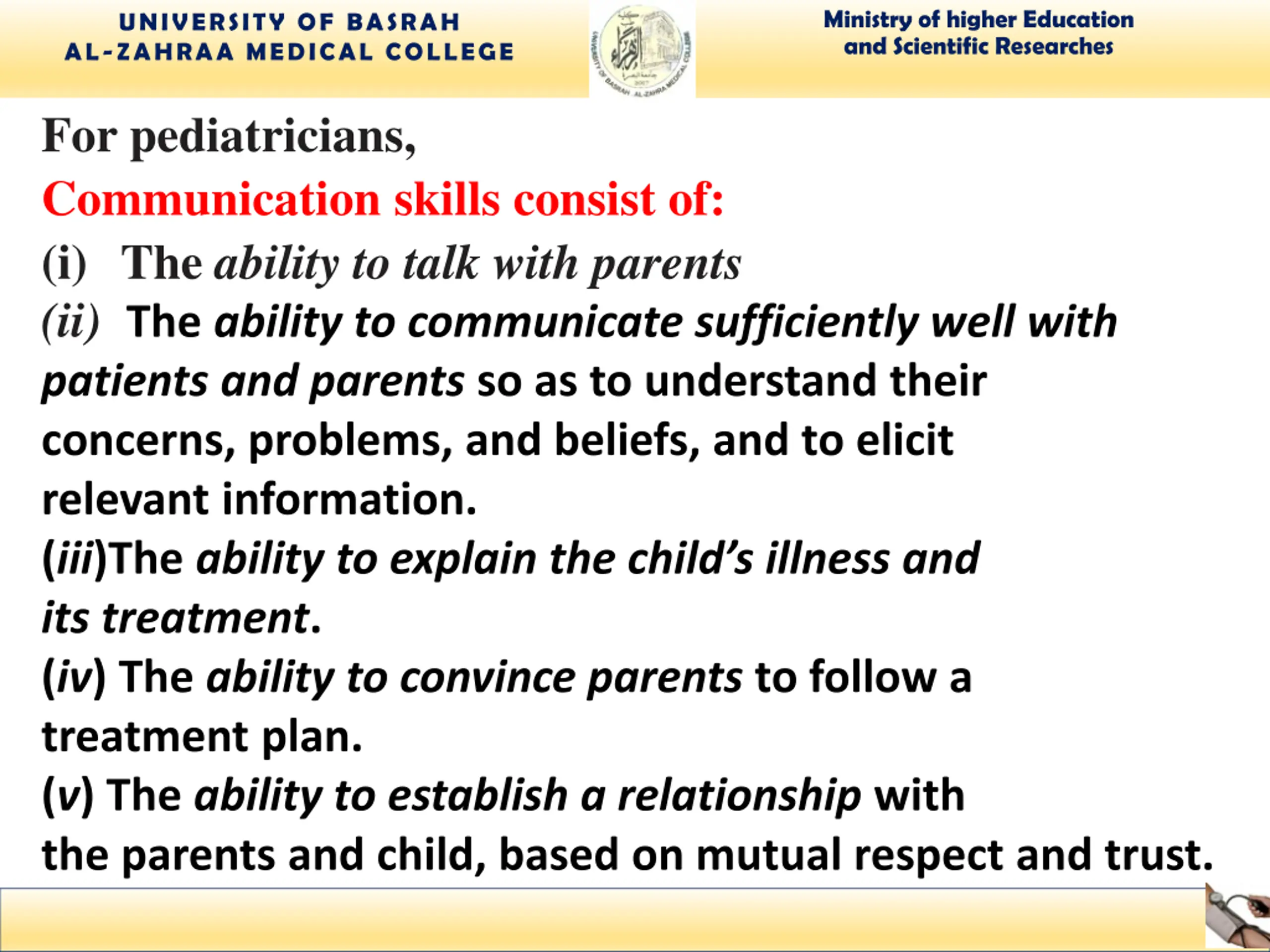 Ministry of higher Education and Scientific Researches UNIVERSITY OF BASRAH AL-ZAHRAA MEDICAL COLLEGE For pediatricians, Communication skills consist of: (i) The ability to talk with parents (ii) The ability to communicate sufficiently well with patients and parents so as to understand their concerns, problems, and beliefs, and to elicit relevant information. (iii)The ability to explain the child s illness and its treatment. (iv) The ability to convince parents to follow a treatment plan. (v) The ability to establish a relationship with the parents and child, based on mutual respect and trust.