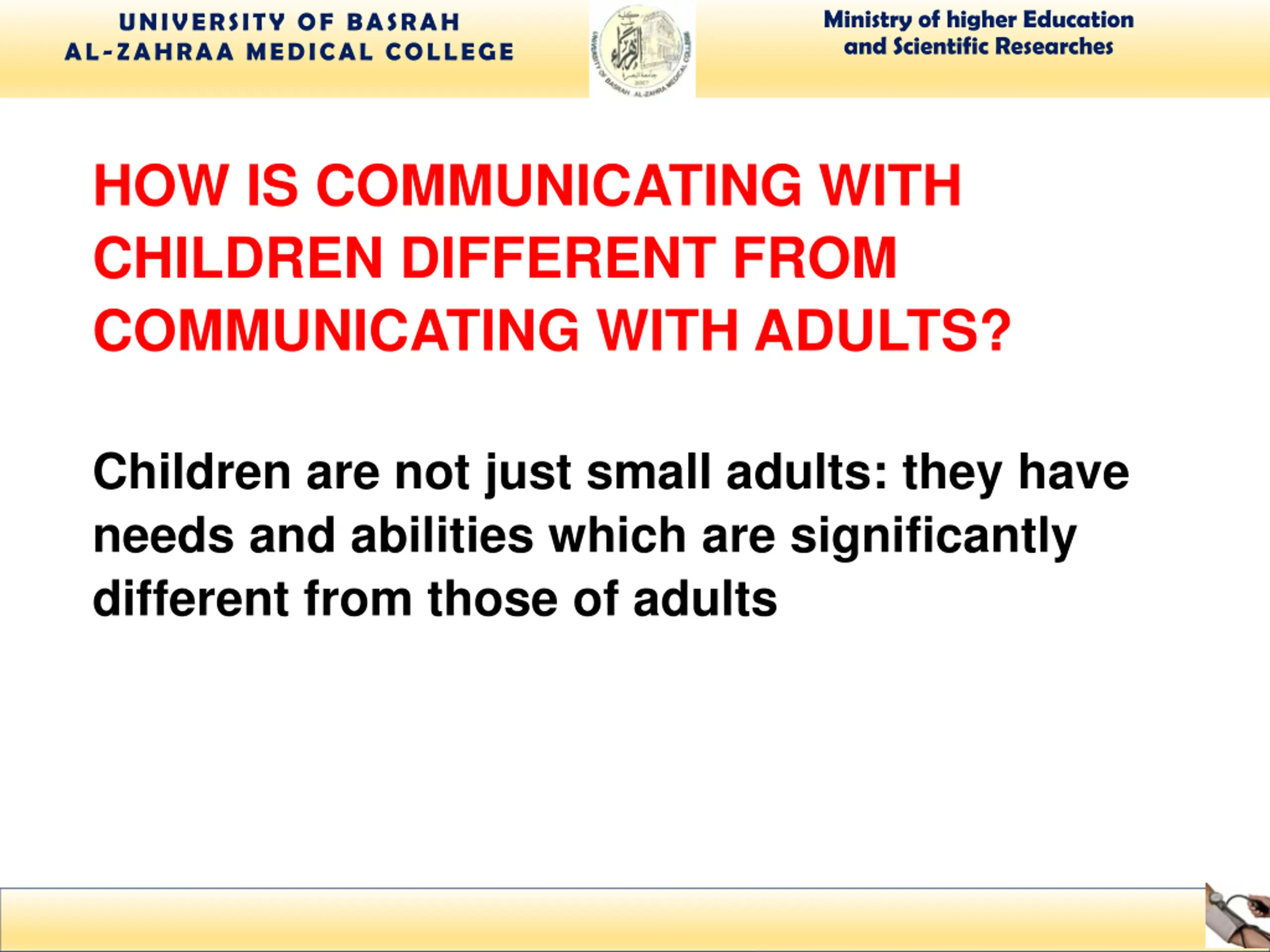 Ministry of higher Education and Scientific Researches UNIVERSITY OF BASRAH AL-ZAHRAA MEDICAL COLLEGE HOW IS COMMUNICATING WITH CHILDREN DIFFERENT FROM COMMUNICATING WITH ADULTS? Children are not just small adults: they have needs and abilities which are significantly different from those of adults