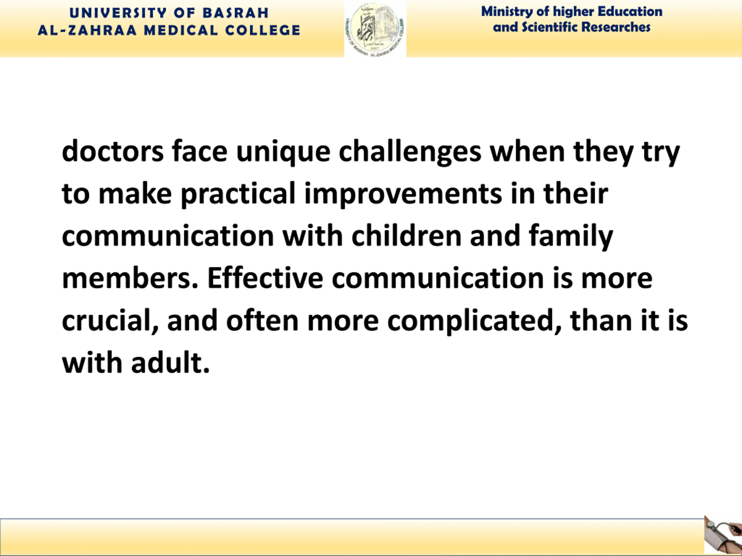 Ministry of higher Education and Scientific Researches UNIVERSITY OF BASRAH AL-ZAHRAA MEDICAL COLLEGE doctors face unique challenges when they try to make practical improvements in their communication with children and family members. Effective communication is more crucial, and often more complicated, than it is with adult.