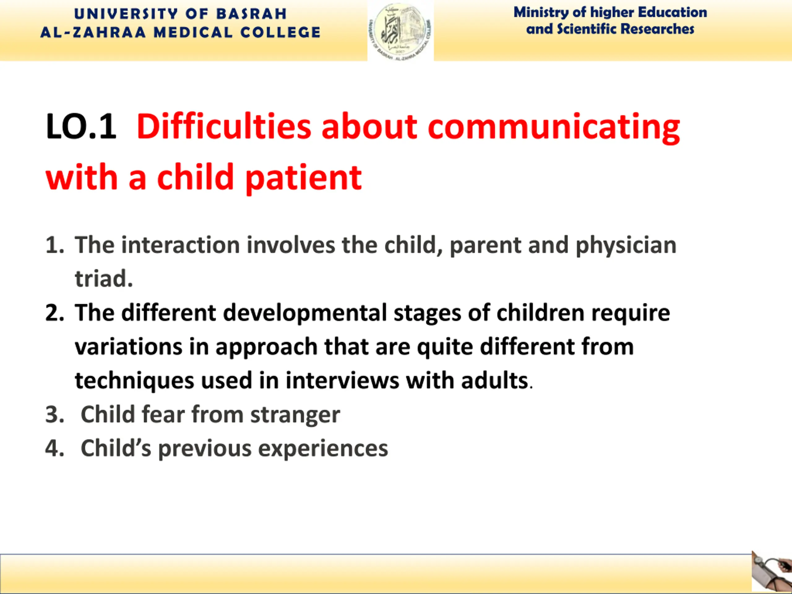 Ministry of higher Education and Scientific Researches UNIVERSITY OF BASRAH AL-ZAHRAA MEDICAL COLLEGE LO.1 Difficulties about communicating with a child patient 1. The interaction involves the child, parent and physician triad. 2. The different developmental stages of children require variations in approach that are quite different from techniques used in interviews with adults. 3. Child fear from stranger 4. Child s previous experiences