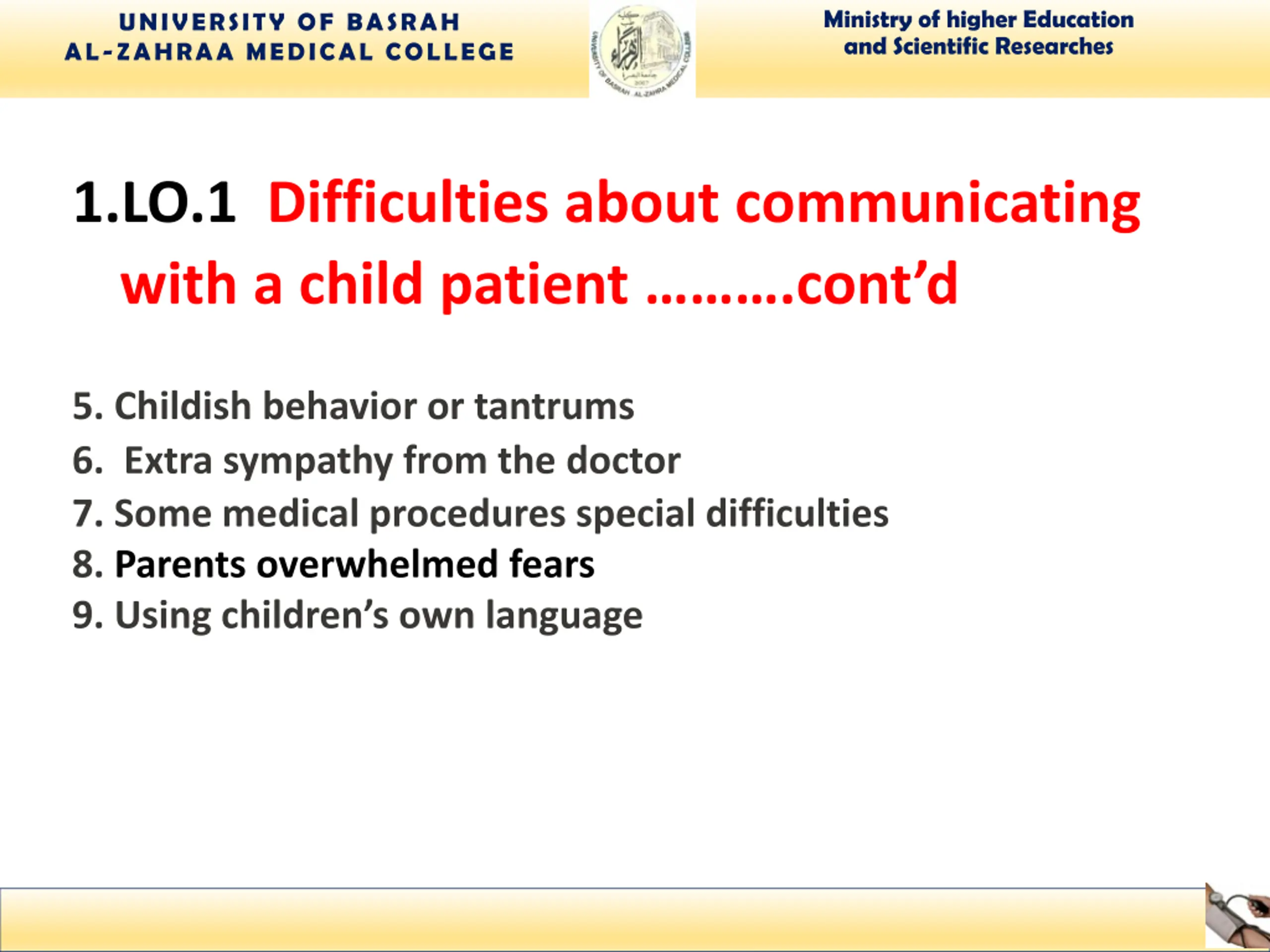 Ministry of higher Education and Scientific Researches UNIVERSITY OF BASRAH AL-ZAHRAA MEDICAL COLLEGE 1.LO.1 Difficulties about communicating with a child patient .cont d 5. Childish behavior or tantrums 6. Extra sympathy from the doctor 7. Some medical procedures special difficulties 8. Parents overwhelmed fears 9. Using children s own language