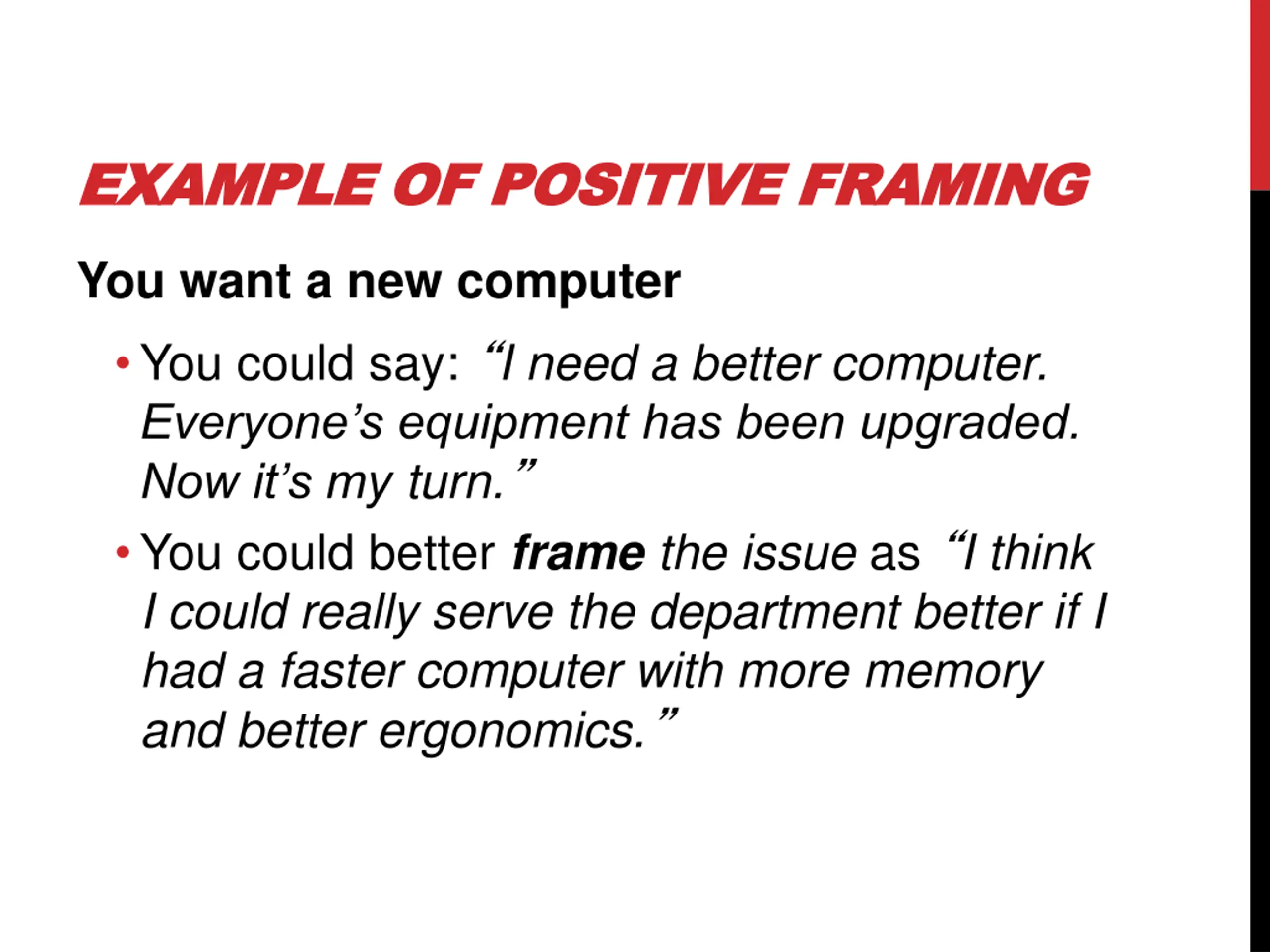 EXAMPLE OF POSITIVE FRAMING EXAMPLE OF POSITIVE FRAMING You want a new computer You could say: I need a better computer. Everyone s equipment has been upgraded. Now it s my turn. You could better frame the issue as I think I could really serve the department better if I had a faster computer with more memory and better ergonomics.