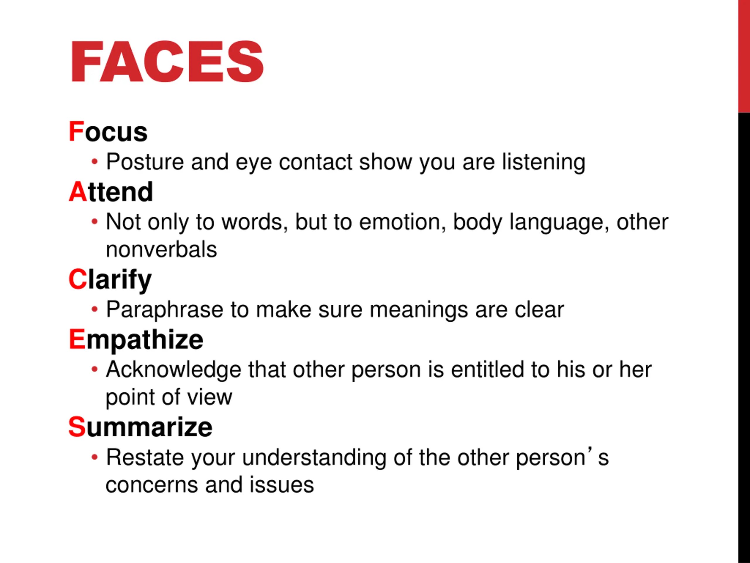 FACES Focus Posture and eye contact show you are listening Attend Not only to words, but to emotion, body language, other nonverbals Clarify Paraphrase to make sure meanings are clear Empathize Acknowledge that other person is entitled to his or her point of view Summarize Restate your understanding of the other person s concerns and issues