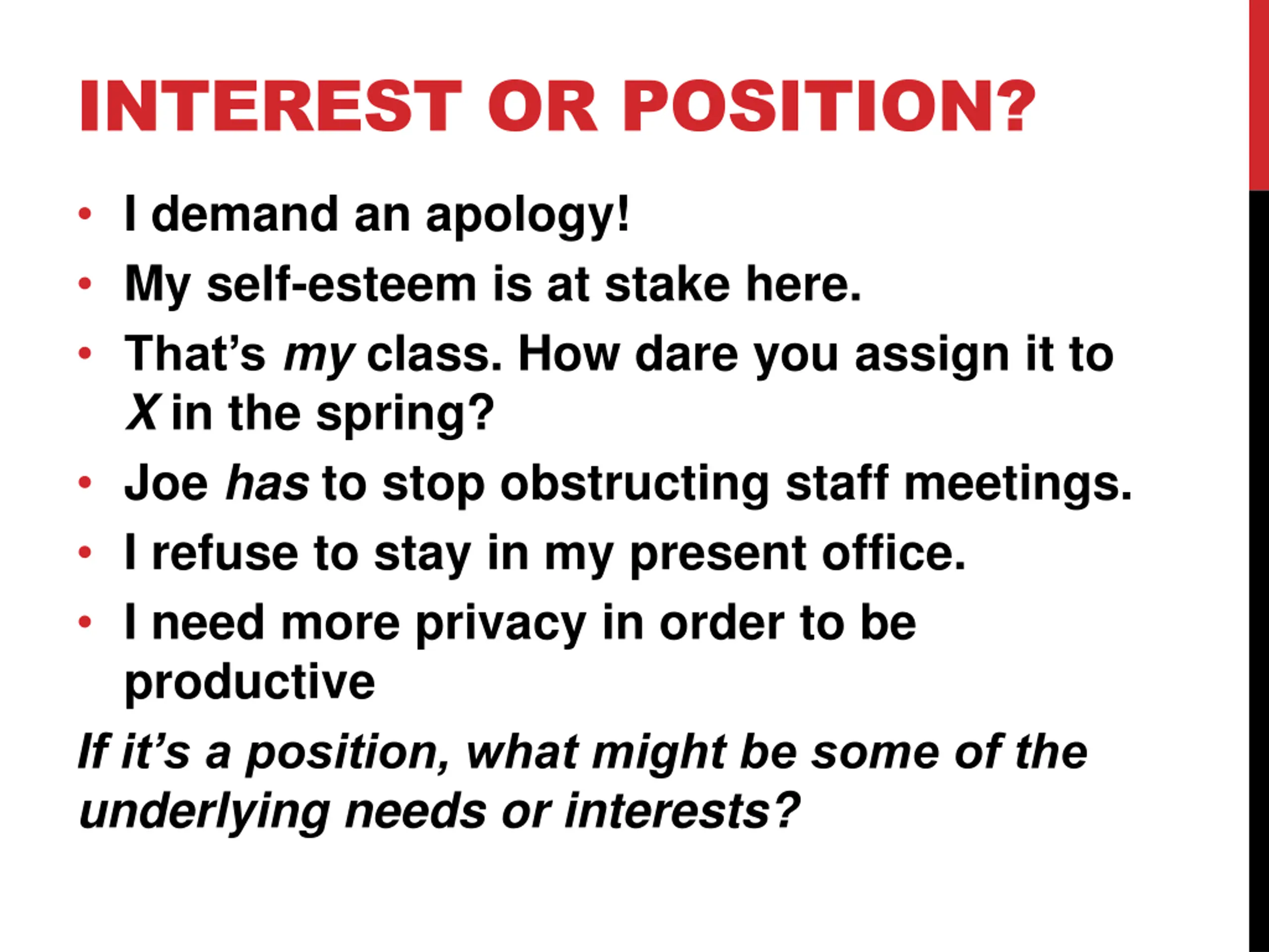 INTEREST OR POSITION? I demand an apology! My self-esteem is at stake here. That s my class. How dare you assign it to X in the spring? Joe has to stop obstructing staff meetings. I refuse to stay in my present office. I need more privacy in order to be productive If it s a position, what might be some of the underlying needs or interests?