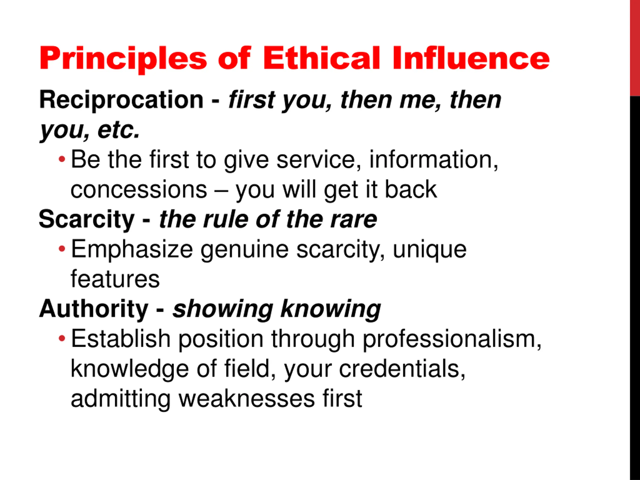 Principles of Ethical Influence Reciprocation - first you, then me, then you, etc. Be the first to give service, information, concessions you will get it back Scarcity - the rule of the rare Emphasize genuine scarcity, unique features Authority - showing knowing Establish position through professionalism, knowledge of field, your credentials, admitting weaknesses first