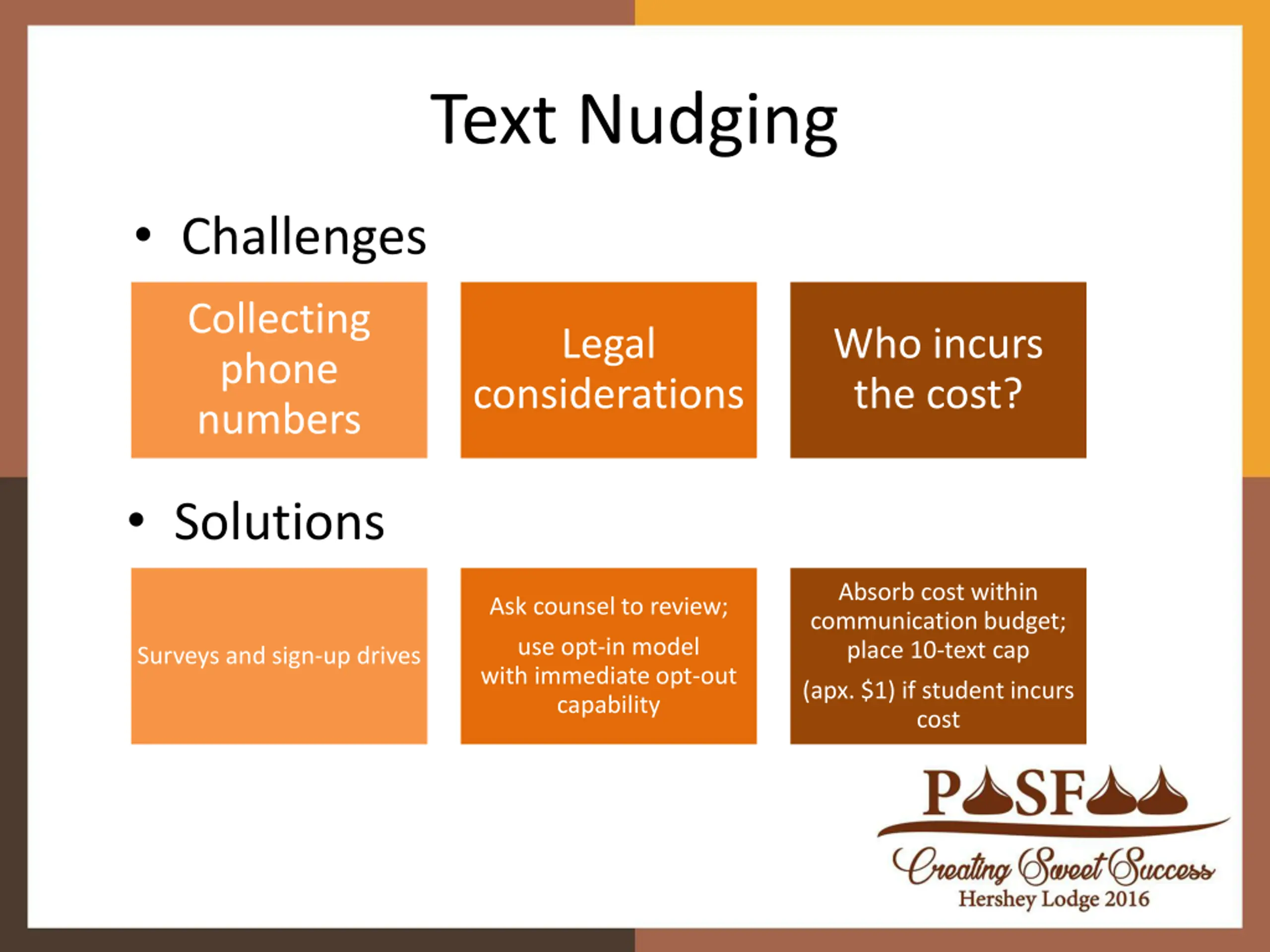 Text Nudging Challenges Collecting phone numbers Legal Who incurs the cost? considerations Solutions Absorb cost within communication budget; place 10-text cap Ask counsel to review; use opt-in model with immediate opt-out capability Surveys and sign-up drives (apx. $1) if student incurs cost