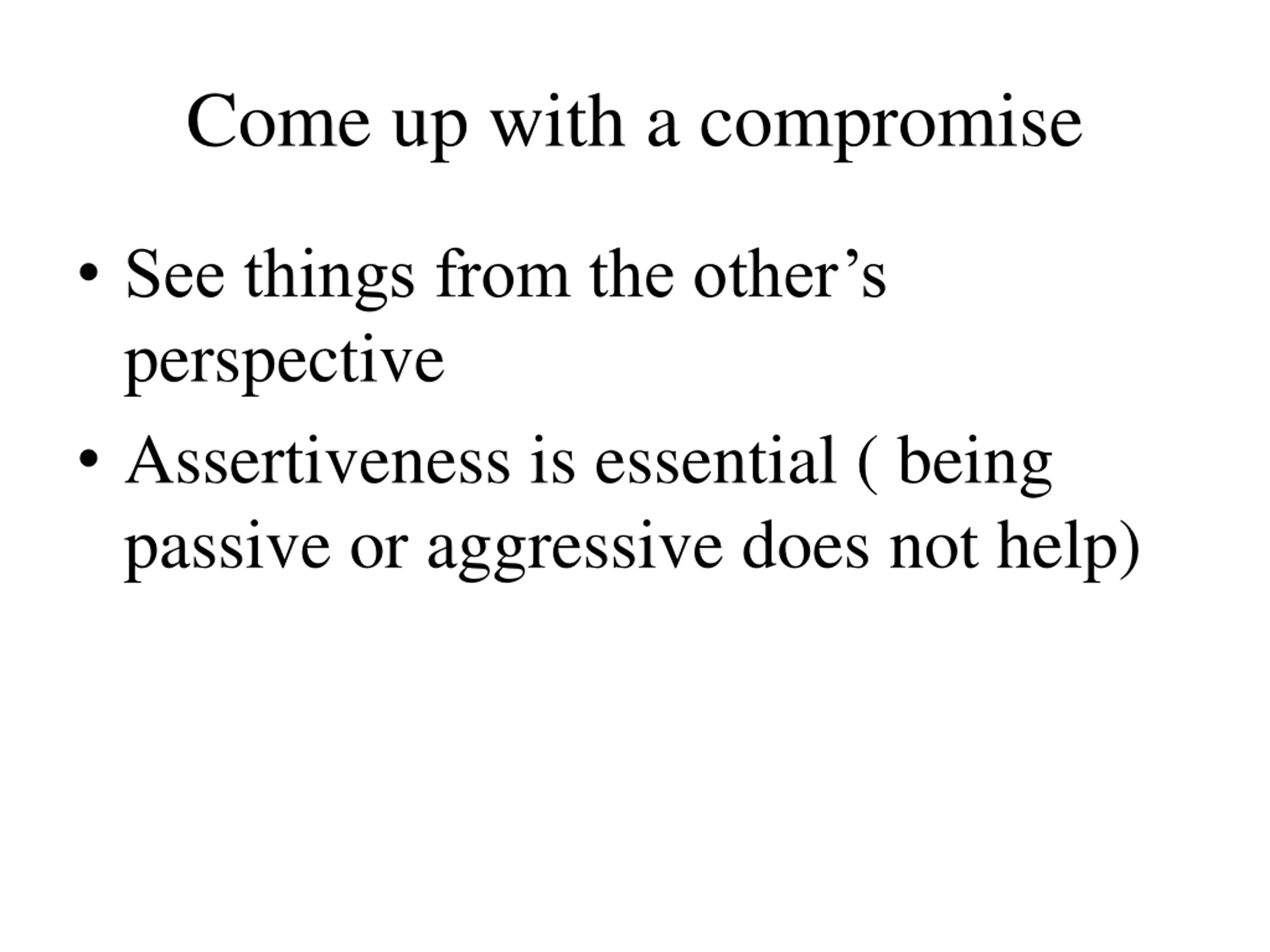 Come up with a compromise See things from the other s perspective Assertiveness is essential ( being passive or aggressive does not help)