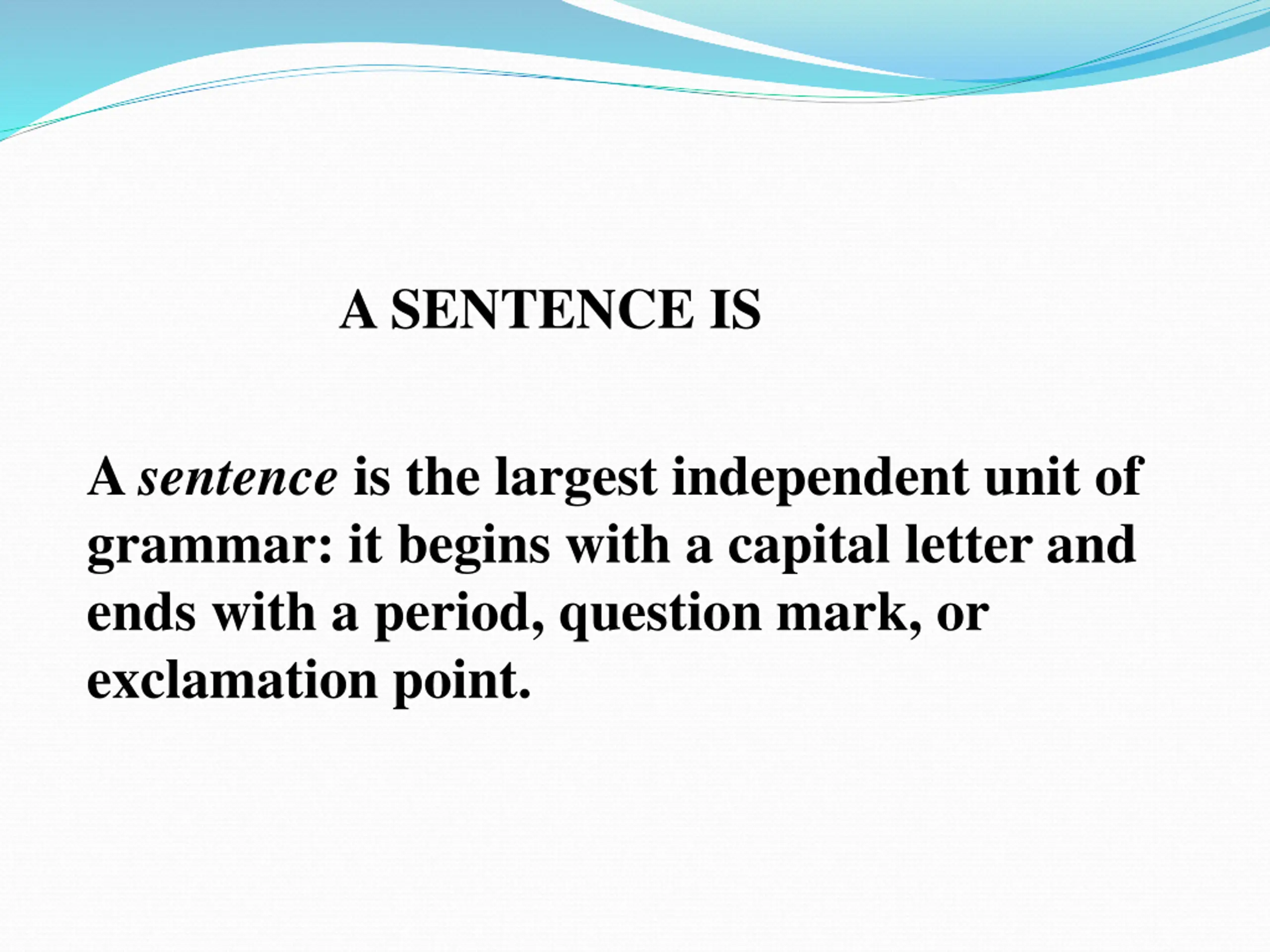 A SENTENCE IS A sentence is the largest independent unit of grammar: it begins with a capital letter and ends with a period, question mark, or exclamation point.