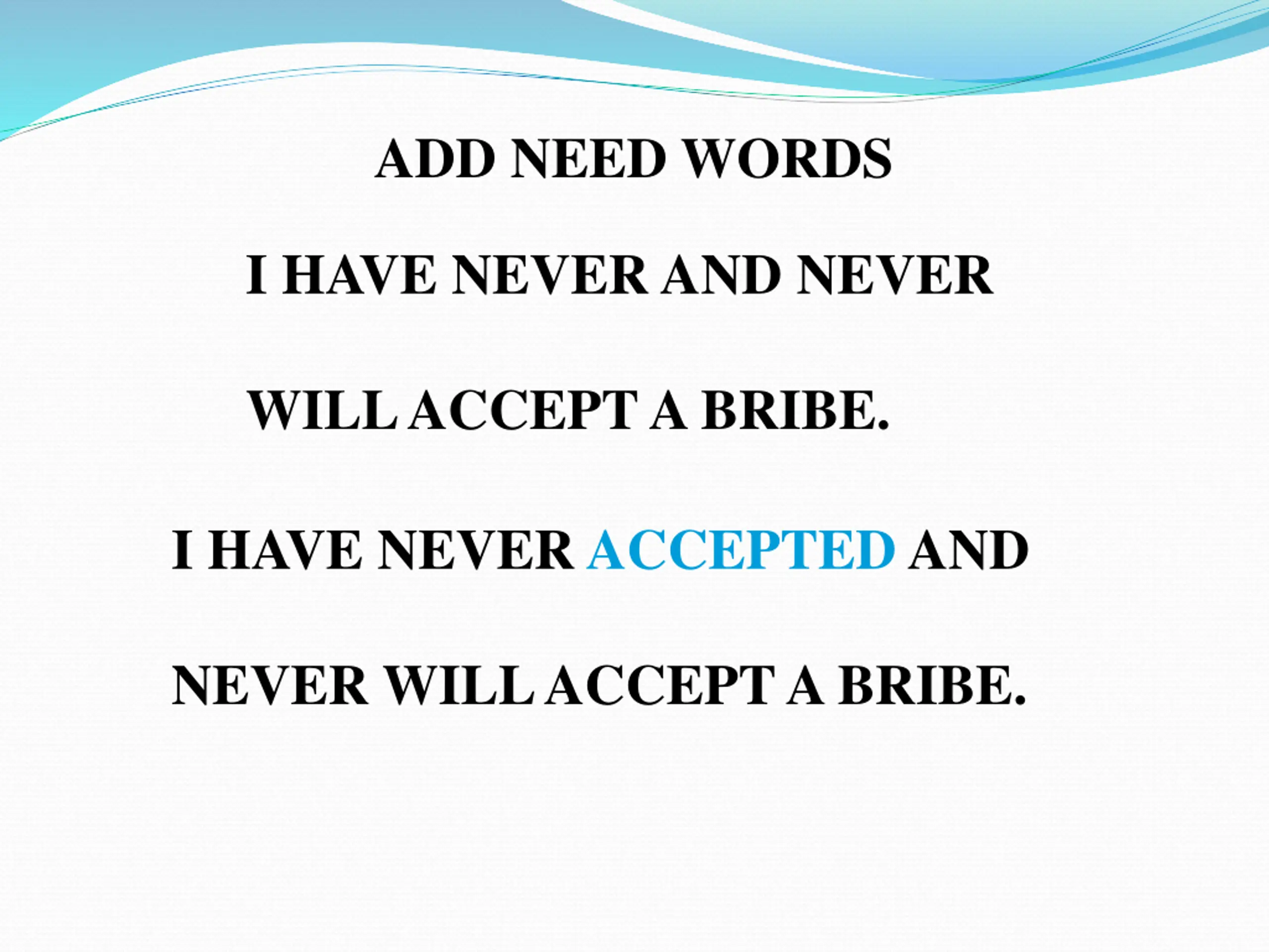 ADD NEED WORDS I HAVE NEVER AND NEVER WILL ACCEPT A BRIBE. I HAVE NEVER ACCEPTED AND NEVER WILL ACCEPT A BRIBE.