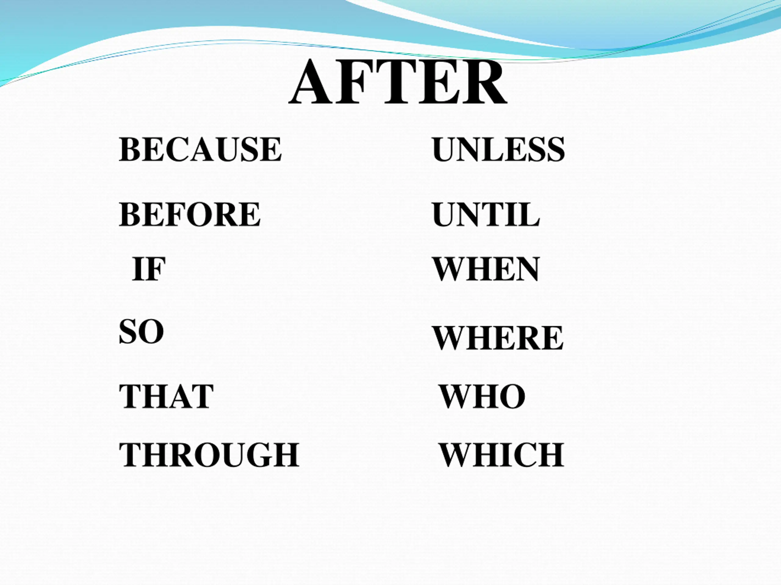 AFTER BECAUSE UNLESS BEFORE IF UNTIL WHEN SO WHERE THAT WHO THROUGH WHICH